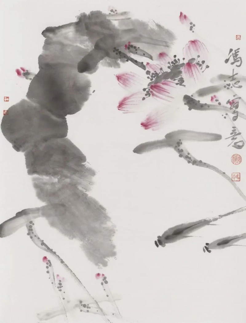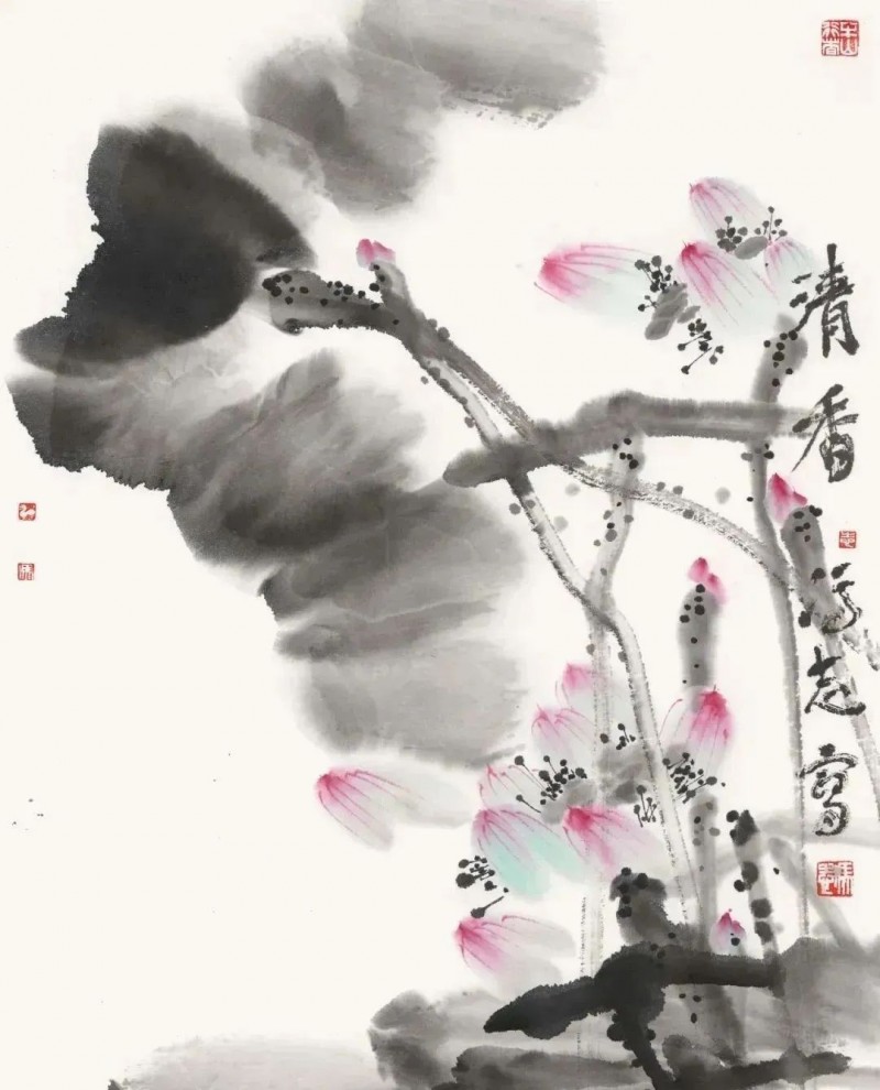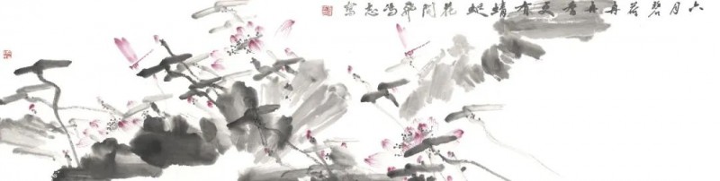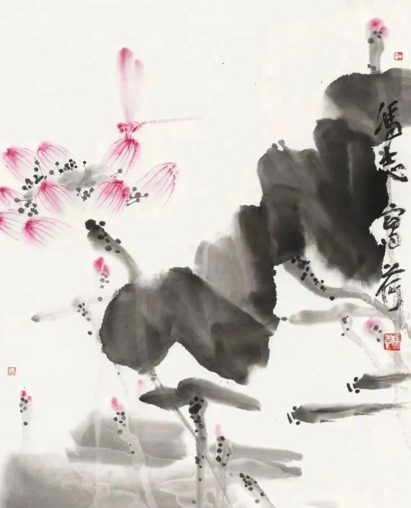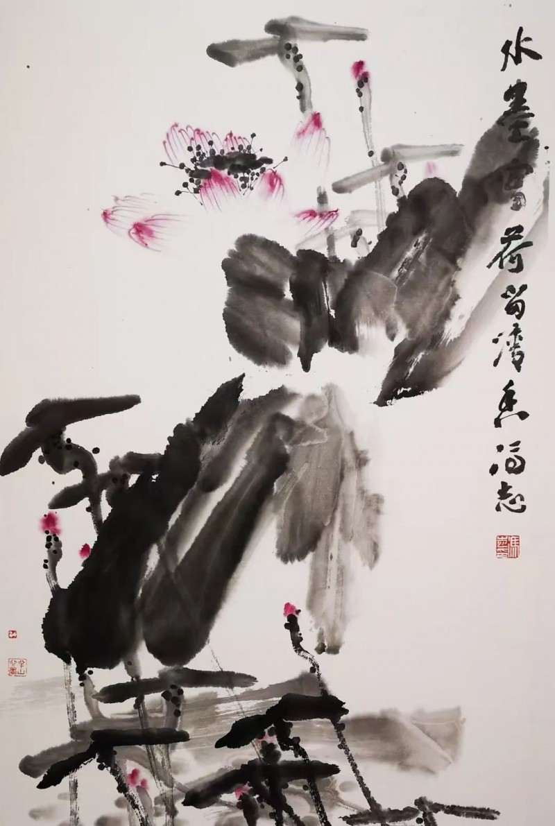 “学古不泥古,破法不悖法”。“真”与“活”是画家的创作之源,擅长“化”让他不断突破自我。近年来自人物而转花鸟,由工笔而转水墨,尤其喜欢画梅花及荷花。他笔下的荷花均是落落大方,雅俗共赏,艳而不俗,沉而不浮,行笔磊落,生动而不粗陋,用墨温润厚重又不失清雅。他的梅花用笔高古,劲挺秀逸,设色清丽,透露出国人自古以来不畏严寒、傲霜斗雪的精神。从实写到虚化,他把梅花清雅高洁的形象表现得栩栩如生。尤其是水墨荷花,更让人痴迷,大笔挥写的荷叶简练大气,用小写意点染的花蕊、花骨朵及蜻蜓等,鲜活地展示了“小荷才露尖尖角,早有蜻蜓立上头”的意境。