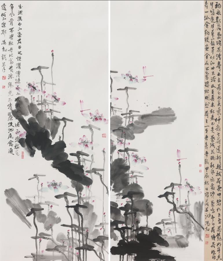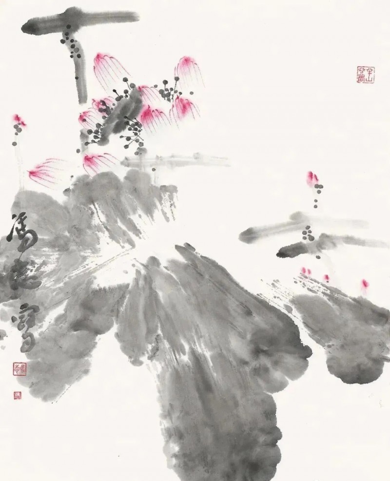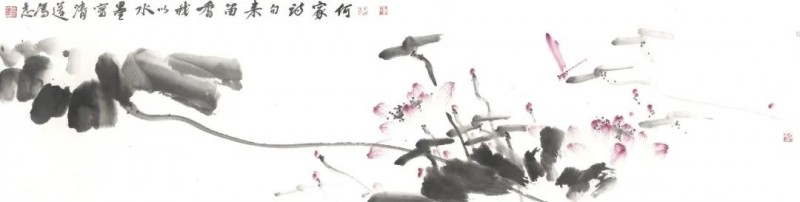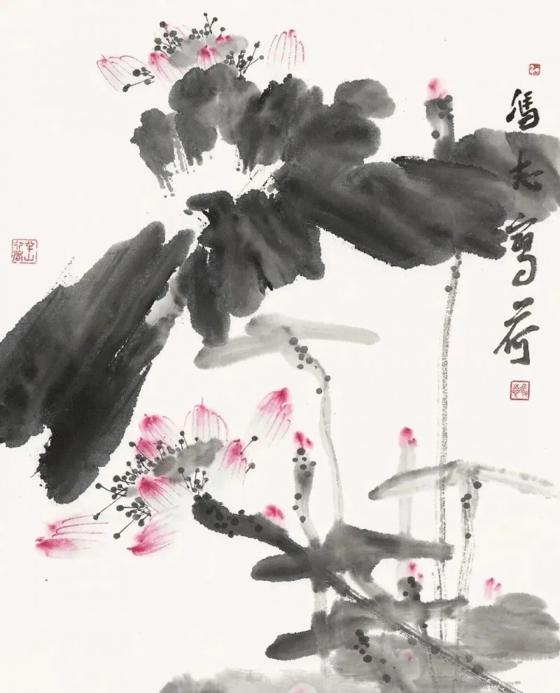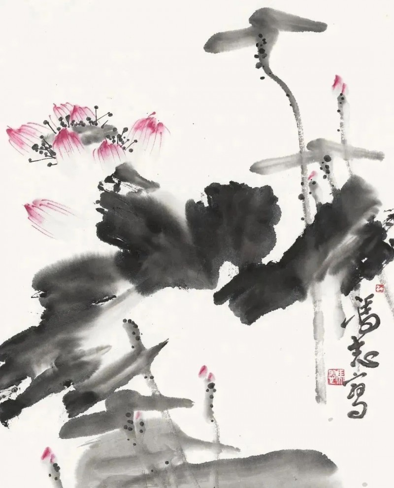 “学古不泥古,破法不悖法”。“真”与“活”是画家的创作之源,擅长“化”让他不断突破自我。近年来自人物而转花鸟,由工笔而转水墨,尤其喜欢画梅花及荷花。他笔下的荷花均是落落大方,雅俗共赏,艳而不俗,沉而不浮,行笔磊落,生动而不粗陋,用墨温润厚重又不失清雅。他的梅花用笔高古,劲挺秀逸,设色清丽,透露出国人自古以来不畏严寒、傲霜斗雪的精神。从实写到虚化,他把梅花清雅高洁的形象表现得栩栩如生。尤其是水墨荷花,更让人痴迷,大笔挥写的荷叶简练大气,用小写意点染的花蕊、花骨朵及蜻蜓等,鲜活地展示了“小荷才露尖尖角,早有蜻蜓立上头”的意境。