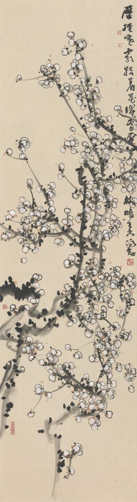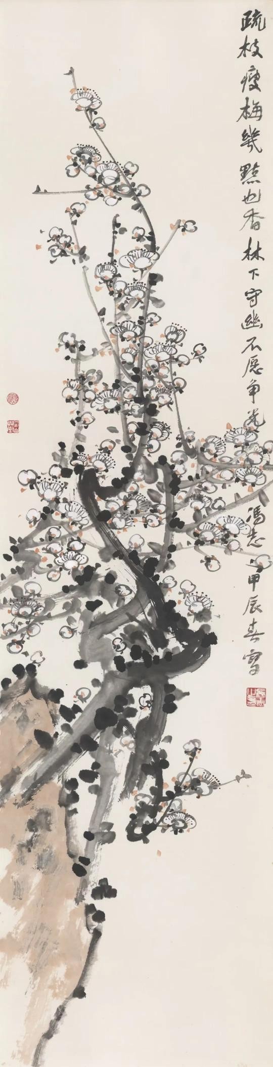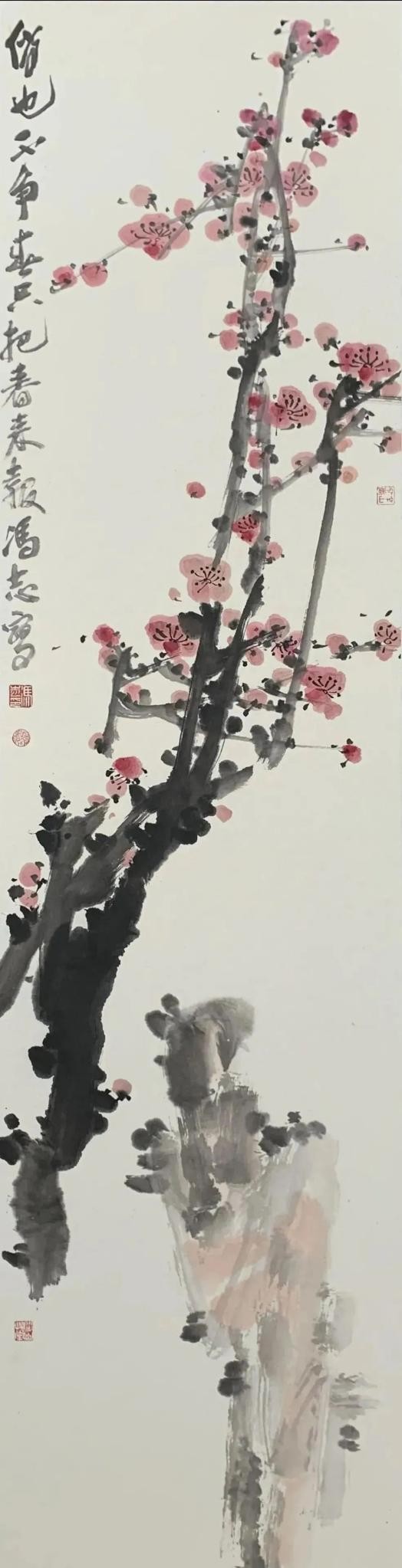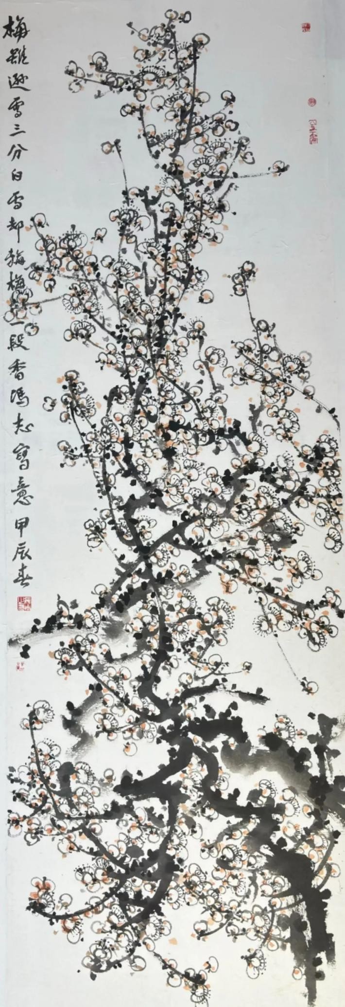梁实秋说过,“我们说读画,实在是在画里寻诗。”诗意地栖居在笔墨世界里,是一种人生境界。绘画是一种精神层面的创造,创作者要写出意境美,笔墨技巧和处理好繁简的形式语言,把握好构图的开合聚散。“历经寒霜始着花,雪压枝头暗生香。”在中国画中笔墨既是绘画语言,更是精神与品格的物化,对自然梅花的钟爱,让画家人格的升华和创意得到了无限的拓展。