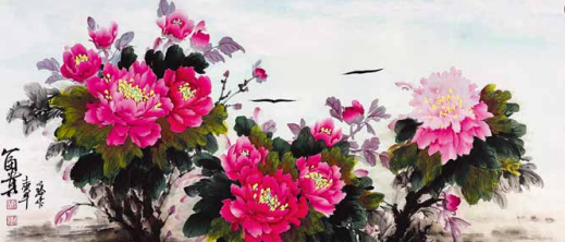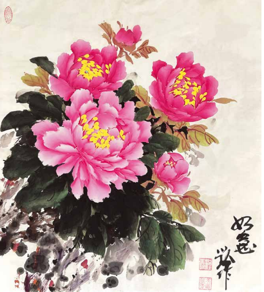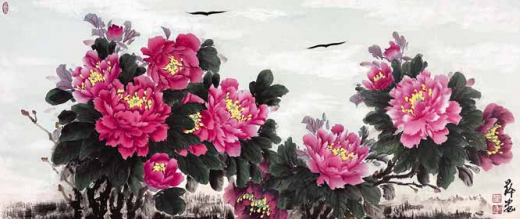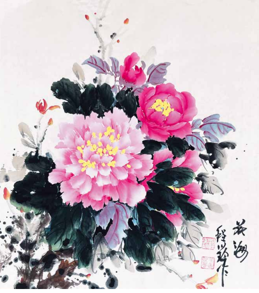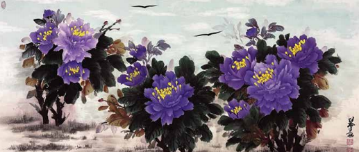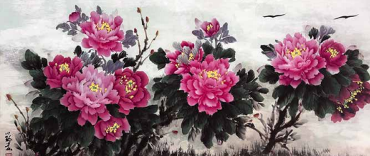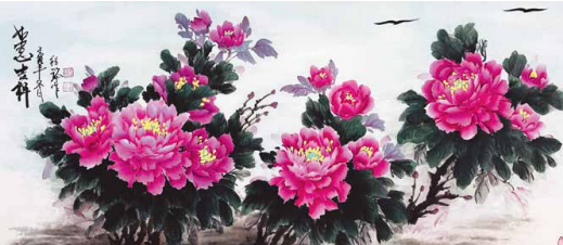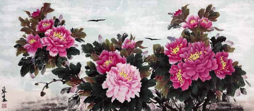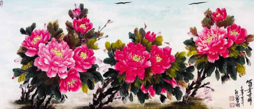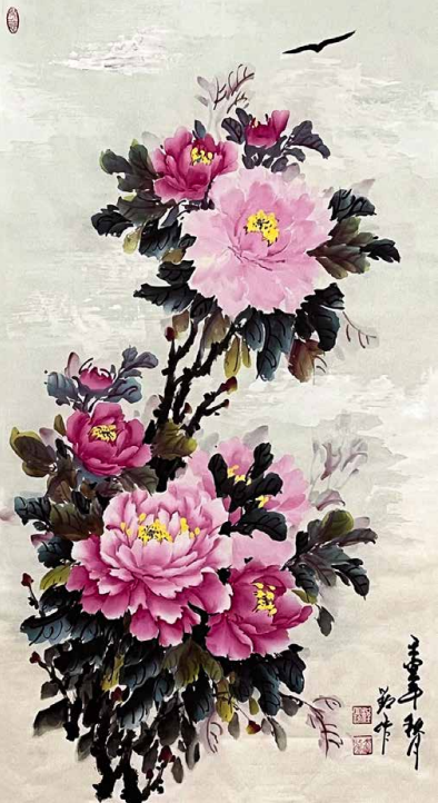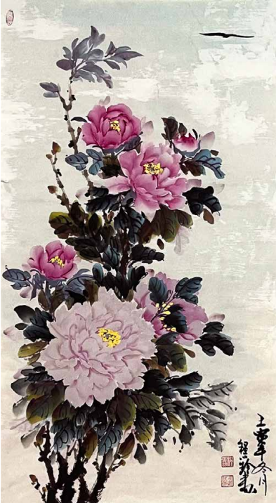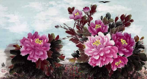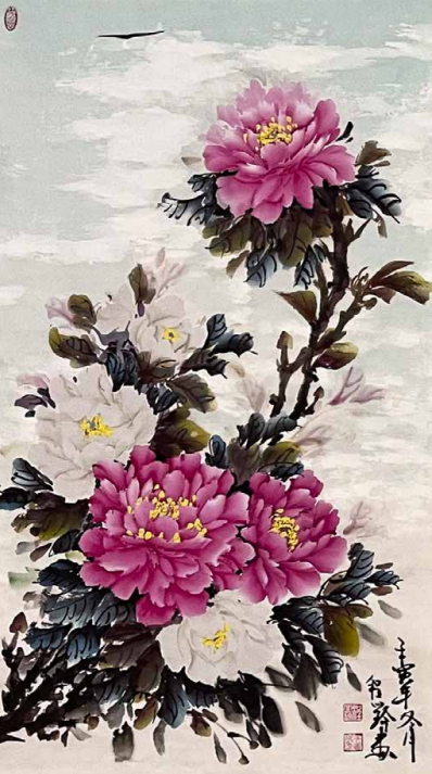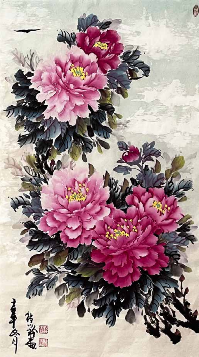 程小玲的内心世界非常强大,她坚信上苍一定会 眷顾她,无论环境如何变化,她始终没有放弃对绘画 艺术的热爱与追求。岁月的磨砺让她对牡丹有了更深 层次的理解,“庭前芍药妖无格,池上芙蕖净少情。 惟有牡丹真国色,花开时节动京城。”刘禹锡的这首 《赏牡丹》特别熨贴程小玲的心。程小玲毅然拿起画笔,她要将印在童年梦里的意象、受尽磨砺的各种情 感,以牡丹为绘画语言表达出来。多年来,她遍访名师,游历国内牡丹之乡,丰富了自己对牡丹的形态之美、神韵之美、色彩之美的理解,刻苦专研画技, 并赋予笔下牡丹的独立与审美,在传统的中国画基础上、她大胆运用了西画的元素,将牡丹的雍容华贵,清雅脱俗;傲骨迎风,温婉瑰丽,似花开纸上,暗香盈袖,画如其人,情形俱到。被海外华人亲切地赞她为“牡丹女神”。