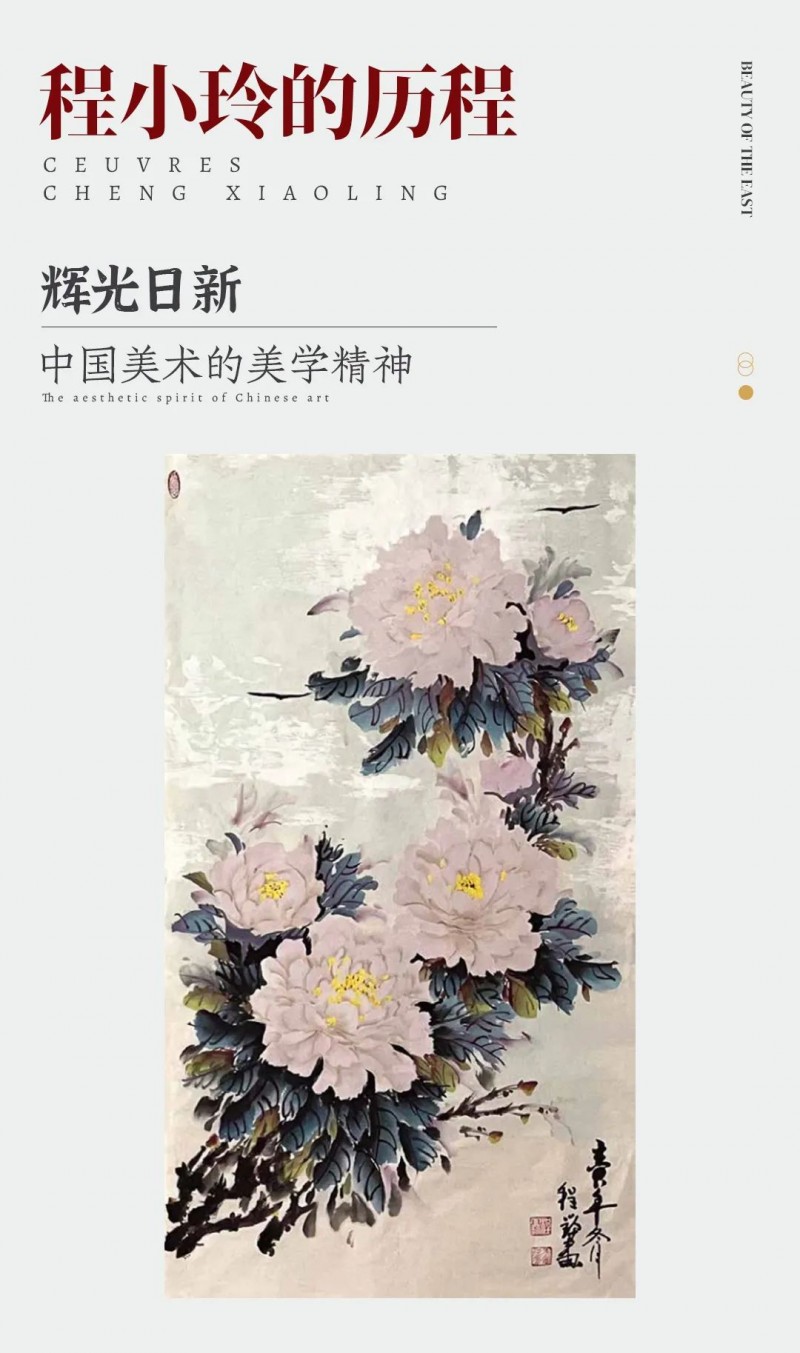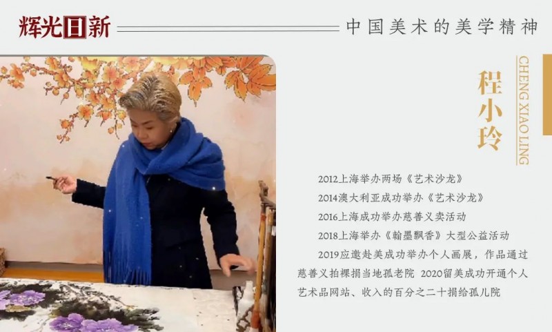 宝剑锋从磨砺出,梅花香自苦寒来。辛勤的付出总会结出丰盛的果实。2012 年,程小玲在上海世纪 海景成功举办了艺术沙龙;2014 年、2016 年分别在澳大利亚西部、上海成功举办了“让艺术与慈善同行” 画展;2019 年应邀成功在美国拉斯维加斯举办了“蓝 天下的牡丹”画展;2020 年成功在美国开通了个人艺术作品网站;在疫情肆虐全球时,她要求自己在绘画技能方面必须大胆的创新突破,她创作了大量的新派作品。2023 年 1 月,终于如约成立了程小玲上海牡丹花艺术馆,有了一个展示自己作品的平台,也为各界喜欢传统文化的朋友提供了一个中外文化交流互动的场所。