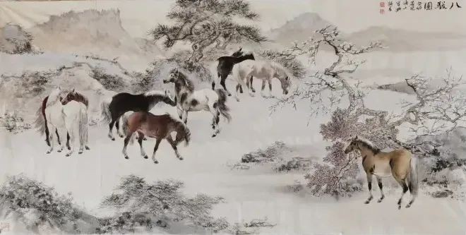 顾马:喜欢的古人是比较多的,山水画有巨然、范宽、李成、郭熙等,他们的作品到现在,我还时不时地经常阅读。明朝沈周的画,我也比较喜欢,他的画面比较丰富。后来看倪云林的平远山水,让我的心里突然回到了一种沉思和内心的自然,感觉这些山水并不是纯粹大自然的,和我的内心还是有交合。画马受到唐宋作品的影响较多,比如说韩干、李公麟、赵孟頫。也受到过郎世宁作品的影响,他的画法接近物体原物的写实,但郎世宁不是以线条为主。中国画同样能够表现出物的原形,用线条就能够表现出这个精气神,那么线条就显得比这个所谓的明暗更来得重要。