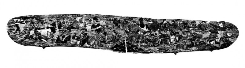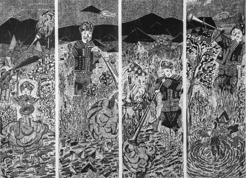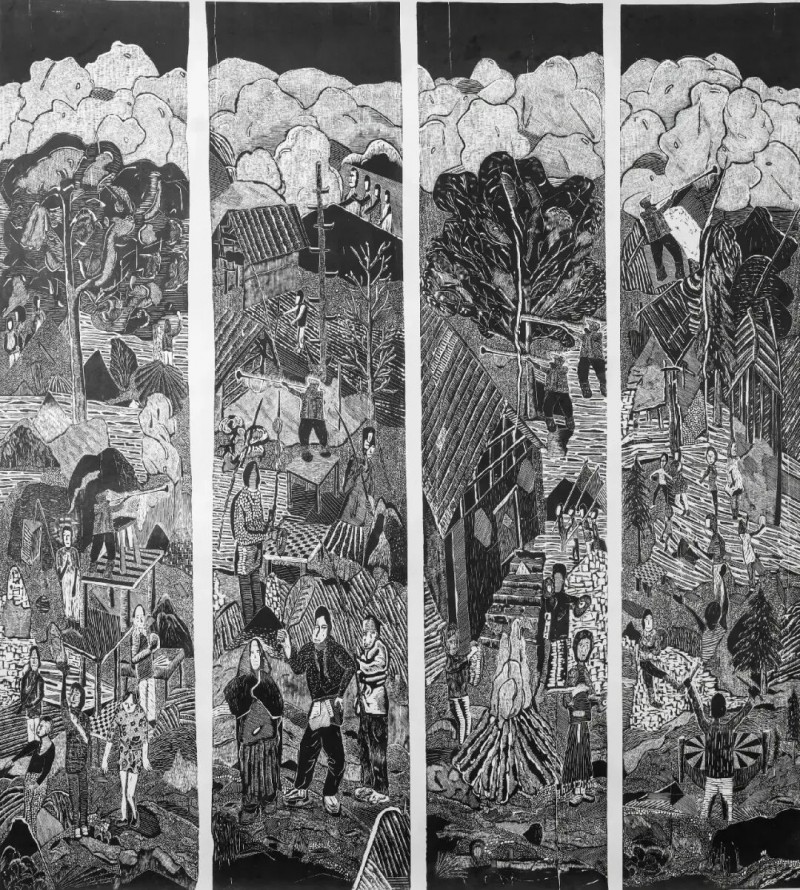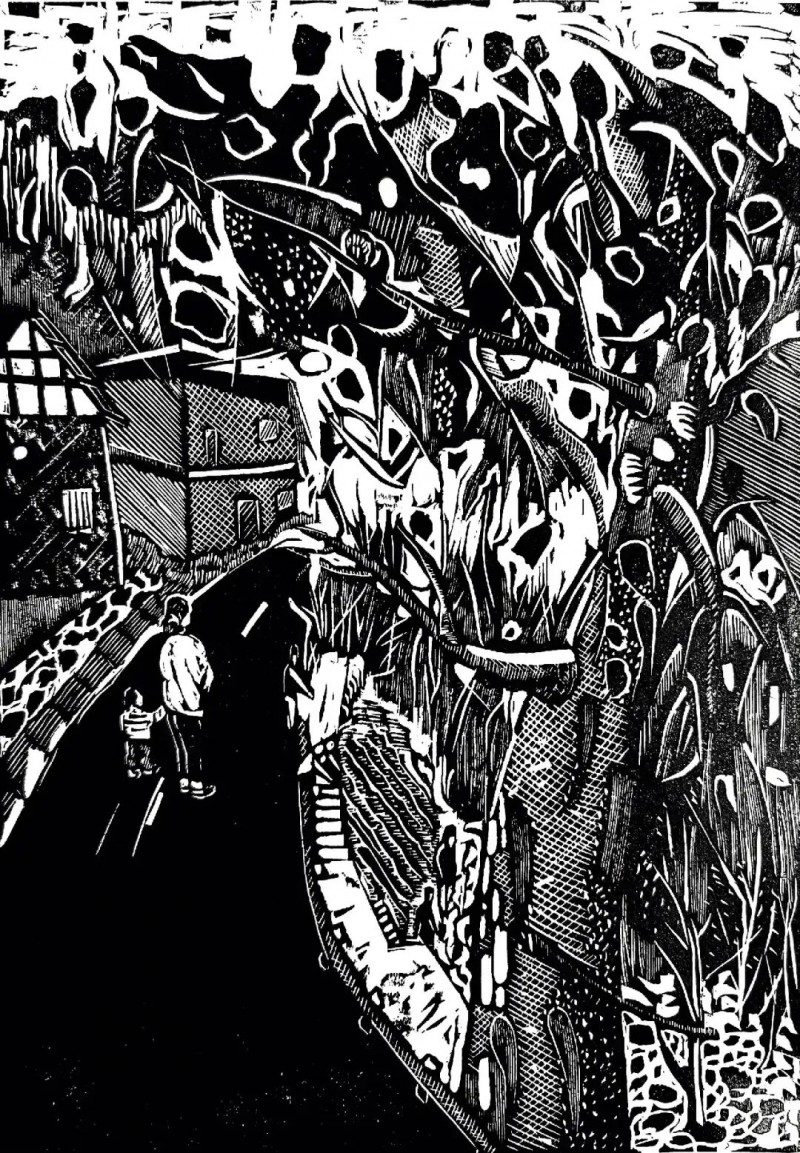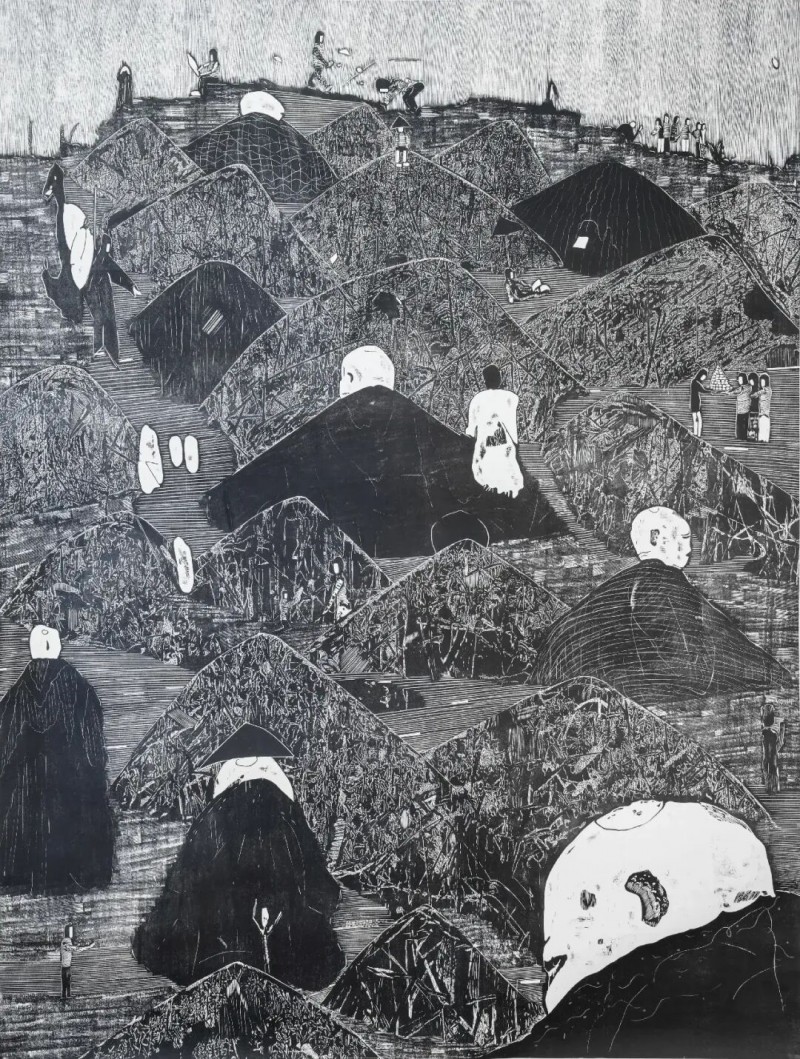 在2016-2017年期间他又创作了大幅黑白木刻作品《圣·山》和《朝·圣》系列,这是他在创作上的一个大胆尝试和改变,这个风格、题材、和观念的巨大改变,也让他在后期对大尺幅版画的控制,画面的构图和技法的转换起到了关键性作用。他作品中选用“光头”作为画面的主体,绝非偶然。他说:生活在当下的人就像迷雾中走失的灵魂,承受着窒息的危险,不断遭遇到某些无形的阴暗的力量的威胁。那惊恐万状的意识、迷失方向的感觉、没有向导的状况,正是画里影藏的东西。它是具有客观的现实意义。
