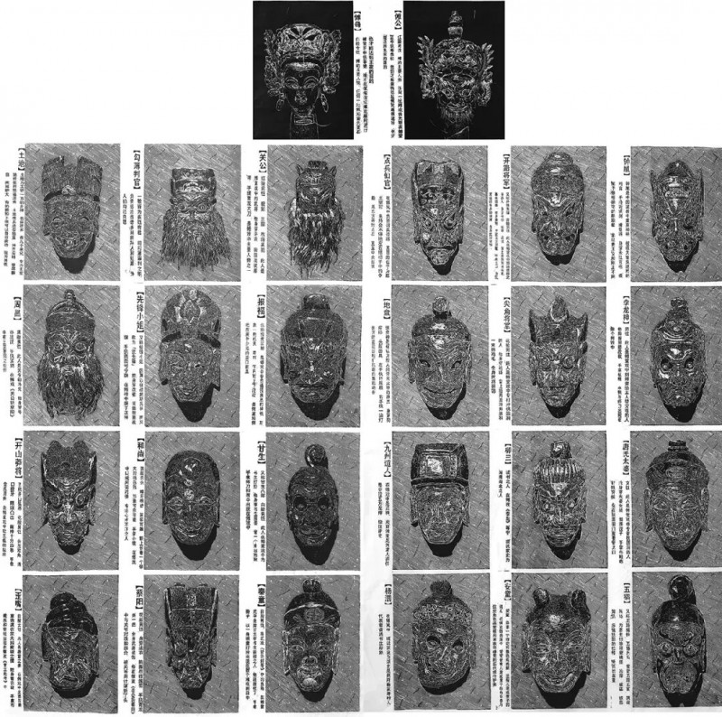 傩戏,是一种古老的祭神跳鬼、驱瘟避疫、庆祝吉事的民俗行为。被誉为“中国戏剧活化石”在贵州保留着各种各样的傩戏形式。傩面具是傩堂戏这一民俗行为中最具有代表性的道具。满堂戏是由二十四个不同的面具组成,傩面具是人类自我转换和超越意识的通道。作品(满堂戏——二十四面生)是通过傩戏文化中面具扮演的角色进行的一次创作转换说明,作品采用排列式、拼接式构图,主要是为了将傩面具各式各样完整合一的展现出来,最上面是傩公傩母,他是傩戏中开坛、还愿等活动中的主要供奉者,用黑白极具分明的形式来突出其地位的存在,其它二十四面这用统一的黑白灰基调来呈现各个面具的独特性,整个画面刀法简练,呈现出一种祥和的画面效果。傩面具的背后是鲜活的扮演者扮演面具本身,是在木质材料上雕刻而成,木刻版画也是在木质材料上雕刻而成,从某种意义上讲有一种共生的效果,所以取名为(满堂戏——二十四面生)。