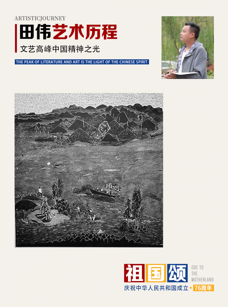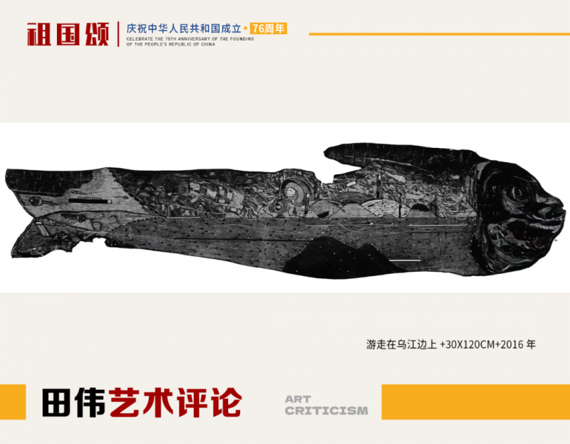在2015年他尝试着创作了当时自己第一幅大型黑白版画作品《收》,尺寸60×90cm,接着2015年至2016年期间创作了木口木刻版画《游走在乌江边上》,这张作品的出现,对他在艺术道路上起到了关键作用,也是到现在为止最能表达和概括他艺术语言的作品之一。观画面本身,外形像一条鱼,画面中选择的场景很特别,一条乌江、一道河岸,水里的小蝌蚪与岸上的人,都在竭尽全力的活成自己想要的生活。田伟谈到:“鱼”是一个吉祥并且生动的素材,而作品的“鱼”非彼鱼的个性特征,表达“鱼”本身个体存在的价值。这种个性化的“鱼”并非只是那一条鱼的重现,是运用脱离具体环境的“干鱼”隐喻现代生存状态里的人,机械的外表,反映的是人的思想的异化。