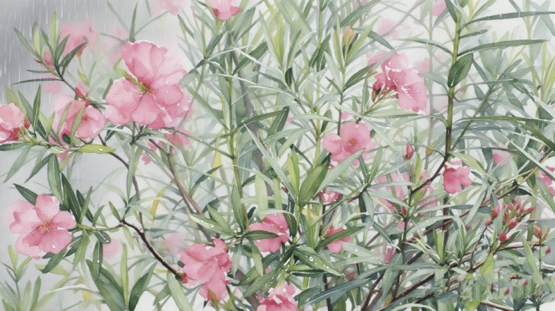 水彩《雨中夾竹桃》60X40cm