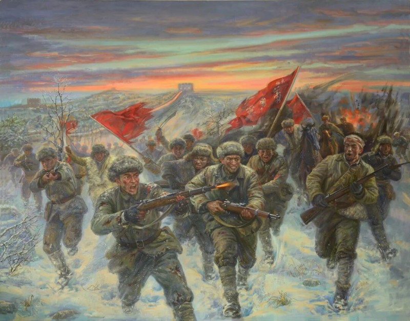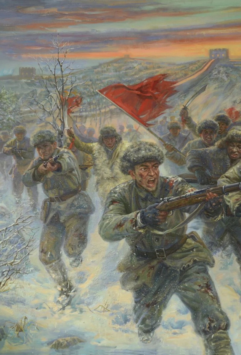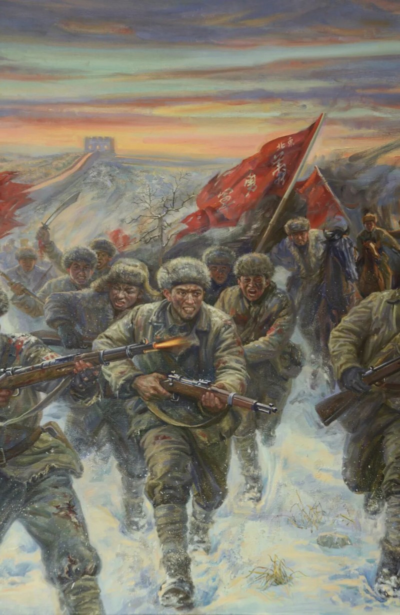 《民族觉醒的序曲——东北抗日义勇军》是今年最新创作。1931年“九一八事变”后东北沦陷,东北民众自发组建了第一支抗日军事武装力量“东北义勇军”,他们由爱国东北退役官兵、农民、地方武装力量、学生等组成。在东北各个地区与日军展开殊死战斗。据统计,1933年义勇军作战达3.9万次,牵制日军兵力超10万,极大消耗了敌方资源。到了1936年,中国共产党收编了东北义勇军,正式组建了东北抗日联军。最早的东北义勇军吹响了中华民族反抗日本侵略者的号角,鼓舞了人心和斗志,田汉、聂耳因此谱写了“义勇军进行曲”,成为了中华民族抗日的精神序章。在我新创作的画面上方,一缕霞光撕开密布的乌云,东北义勇军战士们顶着敌人的炮火,不断怒吼!冲锋!抗争!前进再前进!在义勇军的启示下全国人民掀起抗日浪潮,铸成中华民族的血肉长城!谨以此创作纪念中国抗日战争80周年。