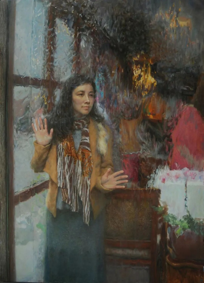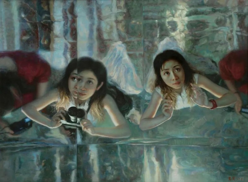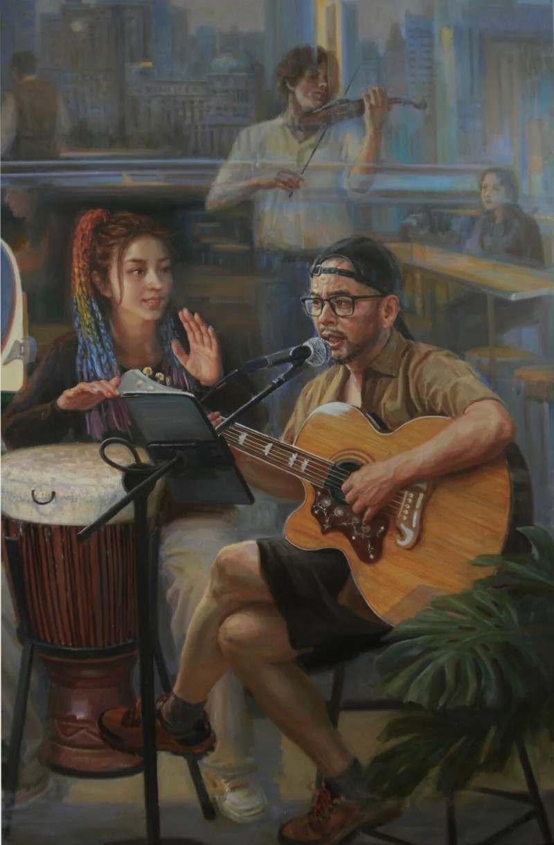 尽管人在我的画面表象的视觉地位并非十分突显,与周围的景物共同构建画面整体形式。但画中,人却是画面的灵魂。而景则不单纯为客观物象,或真实或虚幻,营造出整体气氛,更诠释画中人的情知。在我的“都市人”系列创作中,常以玻璃、镜子为载体,作为一种象征,映射出人物的内心,映射出我对都市人、都市文化的思考。我喜爱将主观与客观,写实与抽象,真实与虚幻相融合,使画中景成为画中人情知世界的荷载。