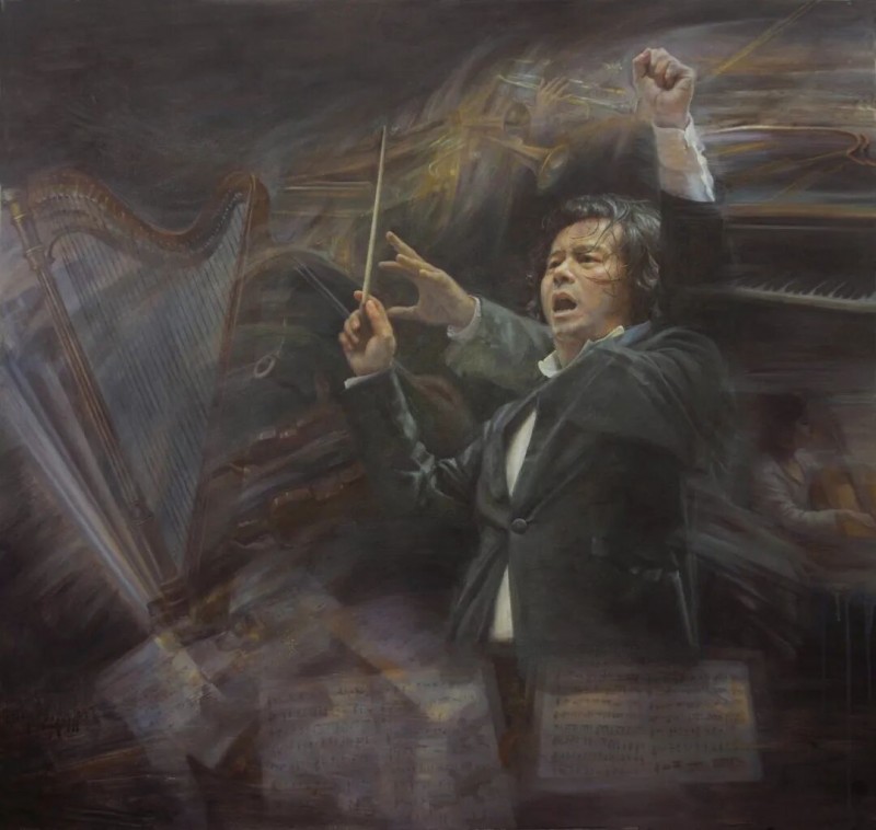 油画作品《生命回旋曲》是《音乐圣殿》的变体,将指挥家置于一个律动激情变幻的画面中。在富于节奏律动感的意象中若隐若现一些乐器、乐谱和人物的物象,回旋的视觉冲击力带来直达心灵的音乐震撼力。通过这种方式我试图以视觉直译听觉的感受。而人物处理也以虚影实影交叠方式表现动感激情瞬间。