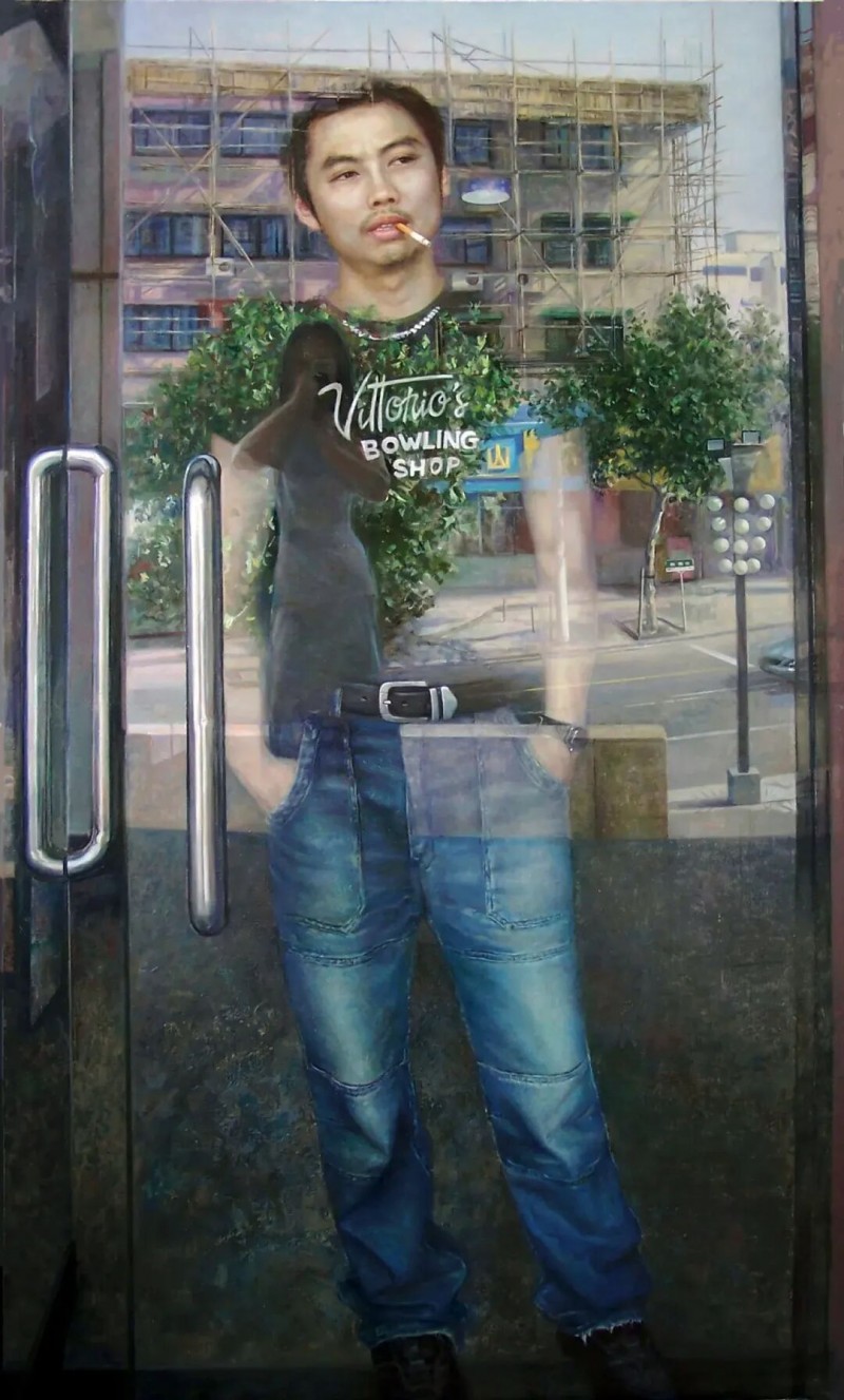《小刘的风景》(入选“精神与品格”中国写实油画研究展,并被中国美术馆收藏)这幅作品从表面看仅仅描绘了小刘站在玻璃门后叼着烟的一个场景片刻,实际在表象后包藏着丰富寓意。作品中的小刘是一个二十几岁的城市小青年,他对自己把握不定,自己有很多想法但都理不清头绪,他的内心很空洞正如画面中身体部分虚化隐形于玻璃门折射的对面的街景。他对自己人生的定位很模糊,对未来既有憧憬又很困惑。身处各种人生导向诱惑的都市中,他对自我的人生规划尚未构建好,就如同他身后玻璃门折射的搭满脚手架的楼房!貌似痞痞的小刘玩世不恭,却又天真稚拙。所以这幅画的题目“小刘的风景”点出了画中景即为人物的内心风景。一切都是象征,自然地融入现实场景中。在表现技法上我喜欢以细致深入的写实手法与偶然天成的肌理表现形成对比,增加画面技法丰富性。这是我的“玻璃门”系列的第一幅。