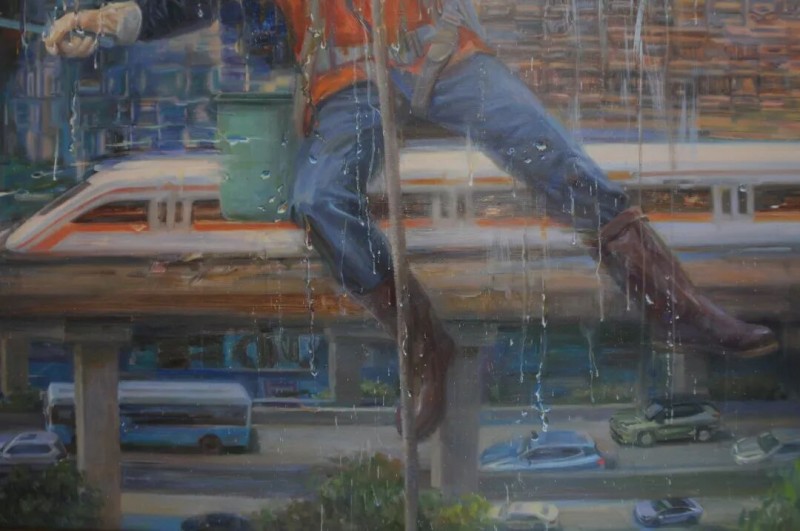 《高楼清洗——涤醒万像》的画面背景是玻璃幕墙的高层建筑,是由众多小格抽象图案组成,这些小格抽象图案各不相同,又整体形成富有节奏感的抽象图式,象征着社会各层面的形形色色的人,共同构成了社会,下方的轻轨城市列车和高架桥汽车与上方的飞机都代表城市高速向前发展,画面中心高空清洗工人在洗刷大楼玻璃,洁净着社会每一方寸,喻示上海大都市的社会万象日新月异。这幅创作是在上海战胜新冠疫情,城市复苏后构思创作,运用的表现手法是以具象和抽象相结合的方式进行创作,展示了一种特别的视觉效果,同时烘托画面主题。