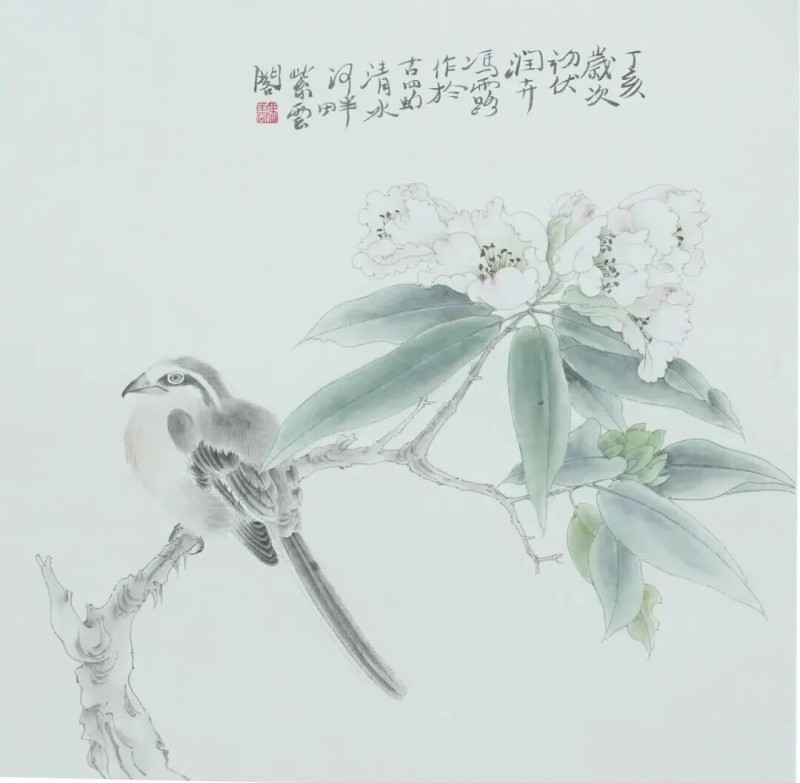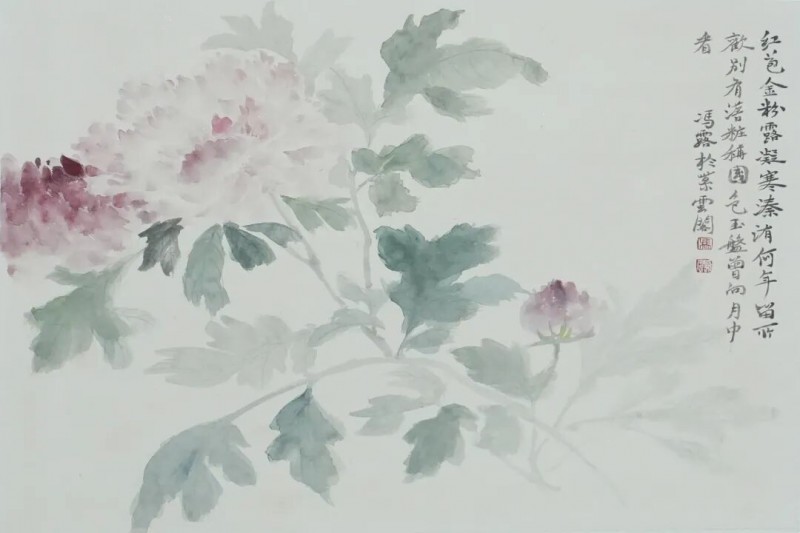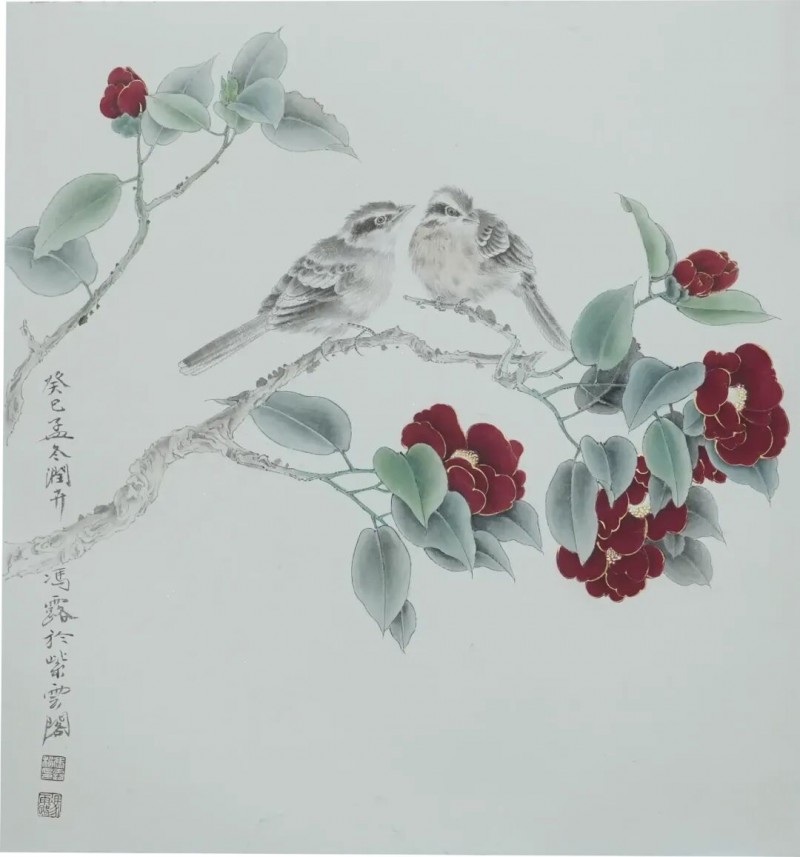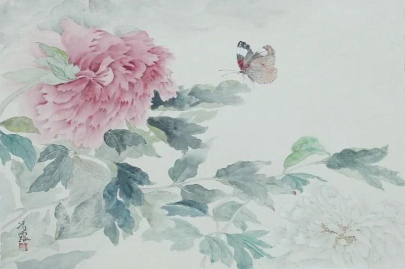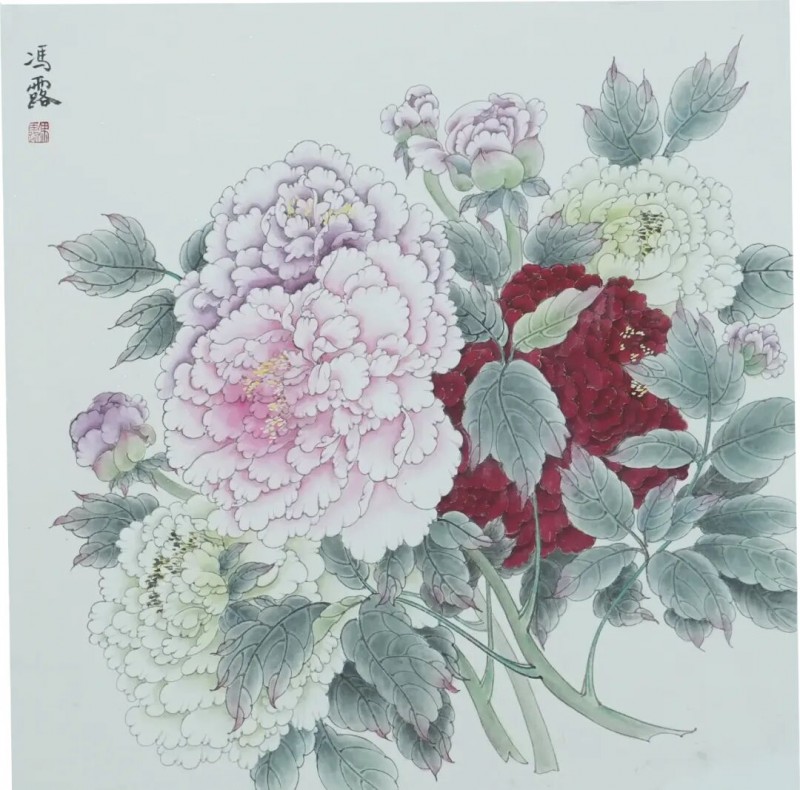 在色彩运用上,冯露展现出了独特的审美与把控能力。她的色彩并非是对自然的简单复制,而是经过精心调和与搭配。在表现花卉的娇艳时,她运用柔和而明艳的色调,既凸显了花朵的美丽,又不会给人以艳俗之感;在描绘枝叶时,深浅不一的绿色层次丰富,营造出一种自然的立体感与空间感。整体色彩和谐统一,营造出一种宁静而美好的氛围,让观者沉浸其中,忘却尘世的喧嚣。