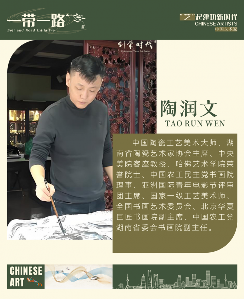 陶润文,中国陶瓷工艺美术大师、湖南省陶瓷艺术家协会主席、中央美院客座教授、哈佛艺术学院荣誉院士、中国农工民主党书画院理事、亚洲国际青年电影节评审团主席、国家一级工艺美术师、全国书画艺术委员会、北京华夏巨匠书画院副主席、中国农工党湖南省委会书画院副主任。 陶润文自幼学习中国传统水墨,为将中西方艺术更好的融合与表现,大学时进入以海派风格为典型的中国美术学院学习油画。