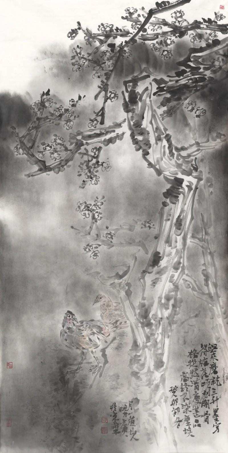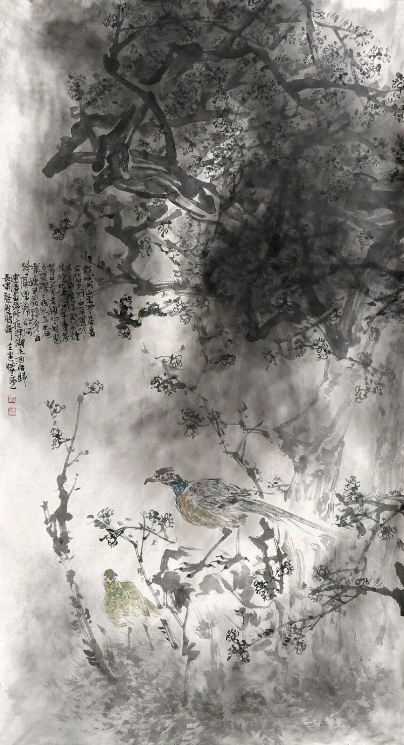 致虚极、守静笃,在“无状之状,无物之物”中谛听宇宙希夷,以真诚的心境朗照自然的赐予,与风云并驱。抽象的写意,不受具象之拘泥,“惚兮恍兮,其中有象,恍兮惚兮,其中有物”,在恍惚中写意镜中月,水中花,臻于至善,临近圣域,“昭昭若日月之明,离离如星辰之行。”陈胜广先行尤擅花鸟虫鱼之作,藻绘图貌,炳蔚画面,富贵的牡丹、清雅的白梅、纯洁的水仙、傲骨的青竹作为主角跃然纸上,是陈胜广先生画面定格中不可或缺的植物家族成员,身着赤橙黄绿青蓝紫的衣装竞相登场放射异彩,花果迎风带露,禽飞兽走,精神脱真(有生气很真实)。