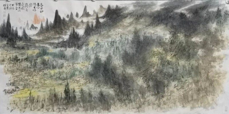 陈胜广先生的山水画布局精妙,仰观星曜,俯察含章,高卑位陈,错落有致。画中日月叠璧,以垂丽天之象;山川焕绮,以铺地理之形。其笔力雄浑,大气苍莽吞吐山河,大有力拔山兮气盖世之态势,可谓“太山遍雨,河润千里者也”;笔法涵纳勾转委蛇、顺逆交合、刚柔兼济的太极意蕴;画作笔致中和天机溢发,彰显自然。在真与奇、华与实、隐与秀、情与采、道与禅之间悠然游走,彰显宇宙生命意识,以形而上之睿智陶铸性情,以抽象笔法恣肆传神写意,其笔简意淡真趣怡然的思想境界,与楚文化中屈原的神秘远游、庄周的超旷空灵相近,在似与不似之间,采掇英华,寻理探赜,与道合一。