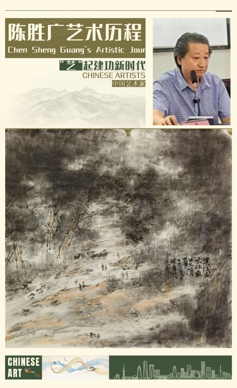 主要艺术活动:2022年元月为人民大会堂创作巨幅山水画”巍巍秦岭万千重”。2021年8月在浙江海宁市钱君匋艺术研究馆成功举办”文心化境 守正致远”陈胜广中国画作品展。2018年11月作品入选中央军委政治部和中国书法家协会主办的庆祝改革开放四十周年全军书法大展。2018年参加中国美术家协会全国中青年文艺骨干和文艺管理干部培训学习。201 7年9月作品入选纪念中国人民解放军成立90周年暨1 3届全军美术作品展获优秀奖。2016年7月作品入选中国美协主办的“吉祥草原、丹青鹿城”全国中国画大展。2016年8月作品入选中国美协主办的“翰墨青州”全国中国画大展。2015年9月作品入选抗战70周年全军美术作品展获优秀奖。2015年6月作品入选中国美协主办的“翰墨齐鲁”全国中国画大展。2014年10月参加“绿墨”——环保科技走进艺术,中国画名家十人展,并获赠新能源电动汽车一辆。201 3年参加导师张立辰先生教学40周年,在中央美术学院举行师生展。201 3年11月在炎黄艺术馆举行教育部(中国首届)201 3届博士毕业展。2012年6月应联合国之邀,在联合国总部成功举办《2012年水墨聚焦走进联合国》2012年7月陪同全国人大常委、法律委员会副主任胡彦林上将,张宗银、盛和泰少将参观 国防科技大学并作画留念。2012年10月中央美术学院博士研究生山东枣庄、河南太行山写生。2012年3月由导师、中国当代著名大写意花鸟画家张立辰先生带队,中国美术学院许江院长、中央美术学院潘公凯院长有力支持;中央美术学院博士生、研究生百余人南下“访师问学、求是得真”于中国美术学院历时月余,访学圆满成功。