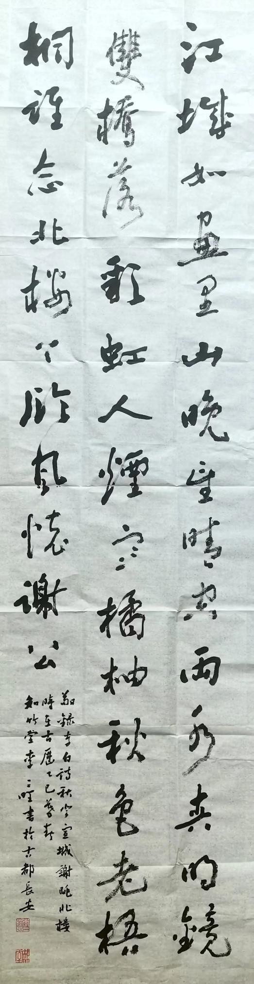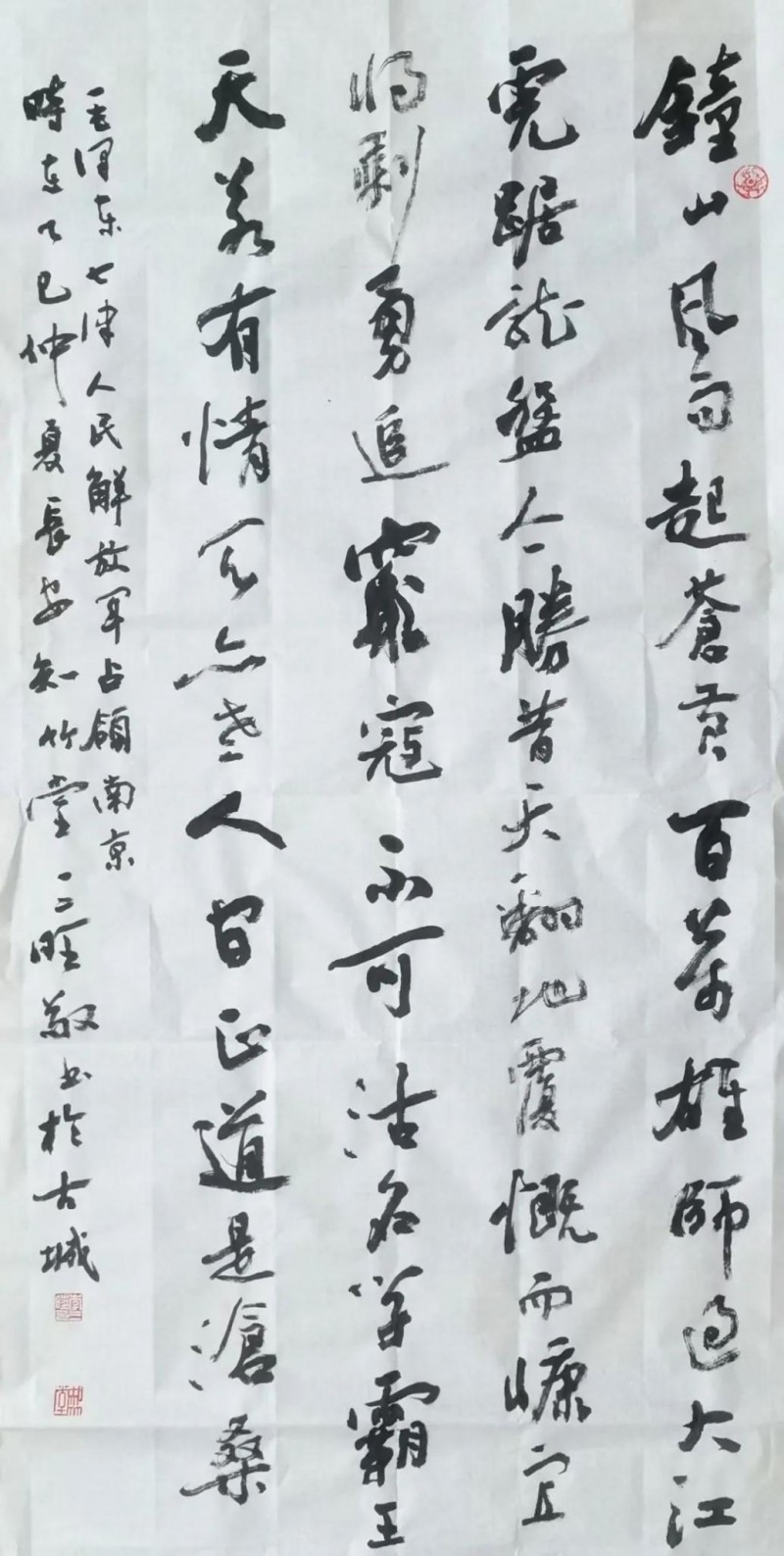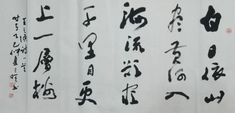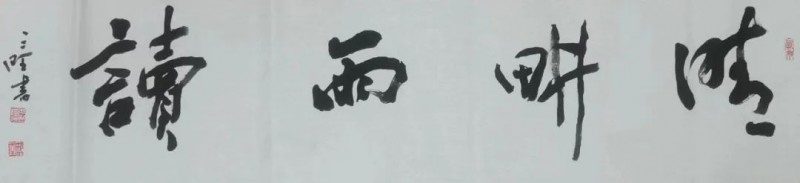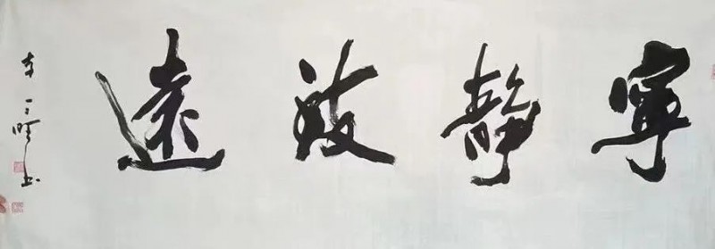 墨色在他笔下是会说话的。他常举王羲之写《兰亭序》的例子:”那天酒酣耳热,墨色随兴致变,才有了’之’字各异的妙处。”自己创作时,他总先读透内容再下笔:写”为人民服务”,用墨厚重如磐石;写”春风又绿江南岸”,墨色便轻快如流水。有回参加纪念活动,写”不忘初心”四字,他特意用了半截残墨,让笔画里带些枯涩,说这样才见岁月打磨的味道。他的墨法里藏着生活智慧:浓淡就像人生起伏,枯润恰似世事荣枯,关键是让这些变化自然流转,如关中平原的四季,该浓时浓,该淡时淡,自有天地节律。