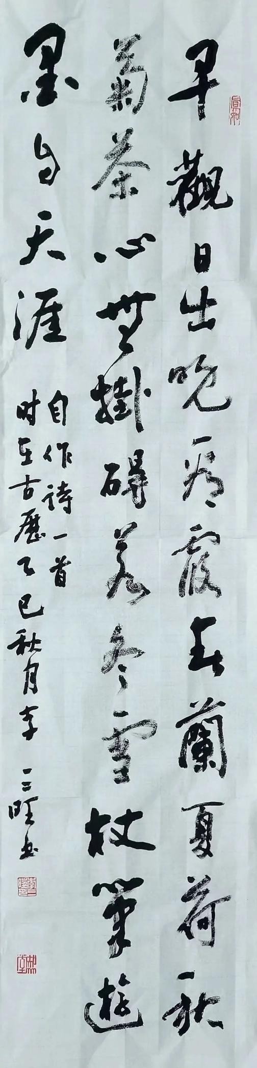 书法里的矛盾,在他看来就像过日子。结体要”中守外放”,好比做人既要守得住本心,又要放得开格局;章法要”疏密有度”,恰似待人接物,既要亲近,又要留余地。有次写大幅作品,开头几个字写得拘谨,他索性停笔喝茶,想起老家盖房的匠人:”梁要直,椽要弯,搭配好了才结实。”回来重写,故意让”天”字舒展,”地”字紧凑,反倒生出错落之美。他常说处理这些矛盾,靠的不是技巧,是修为——就像他小时候见村里老木匠做家具,凿子要利,心思要细,手上的力道全凭多年手感。如今他写字,笔锋的提按顿挫里,藏着的是对生活的理解:刚柔相济不是刻意为之,而是经历过风雨后的自然呈现。