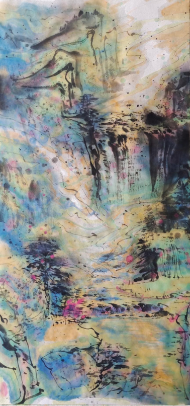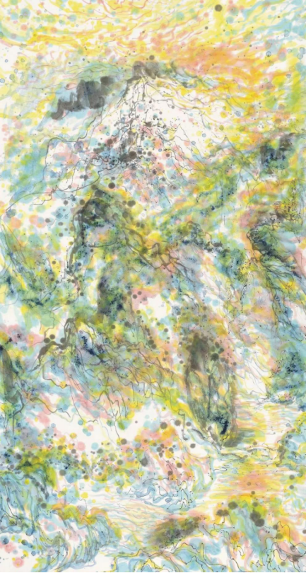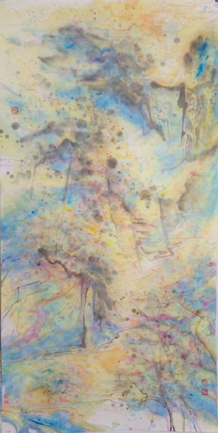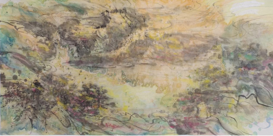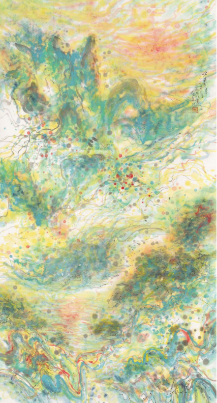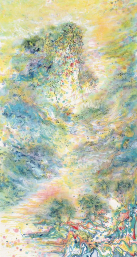 着色焕彩映心迹,不在乎迹在乎意。以色彩为媒介,并通过画笔传达出画家的艺术情感,最终构筑出一幅幅独属于精神层面的山水达观。这些画作表面看似繁丽交织,如梦似幻,但对武根柱先生来说,它们却是对“至纯至简”情感的一种深刻外化。画中隐约具象的氤氲山水,既似又不似,或许这也正是武根柱先生意图向我们传达的哲理:从最初的直观感知,见山是山,见水是水,到后来超脱表象,见山非山,见水非水。而此中的深意,余以为也是仁者见仁,智者见智了……