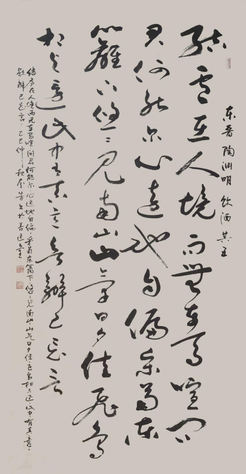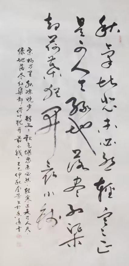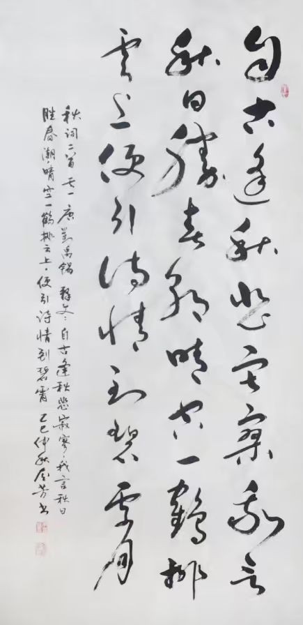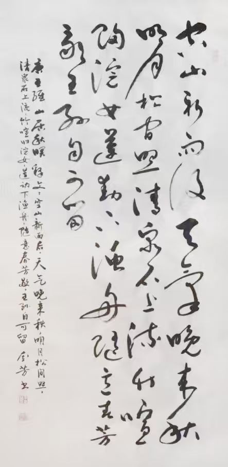 造型布局是一件成功的作品外在内在综合表现,从上可以窥探出书者当时的胆识和灵感。李奎芳不但重笔法,而且重造形。“由表及里,由浅到深”是认识一切事物的一般规律。王羲之、张旭、怀素、黄庭坚、王铎的作品之所以能被后世千古传颂,究其因是有他们各人有各自的面貌和风格。草书创作要想形成自己的个性和风格,笔法固然重要,但造型不可忽缺。李奎芳草书能够形成个人风格,是他重视笔、墨、形的主要原因。