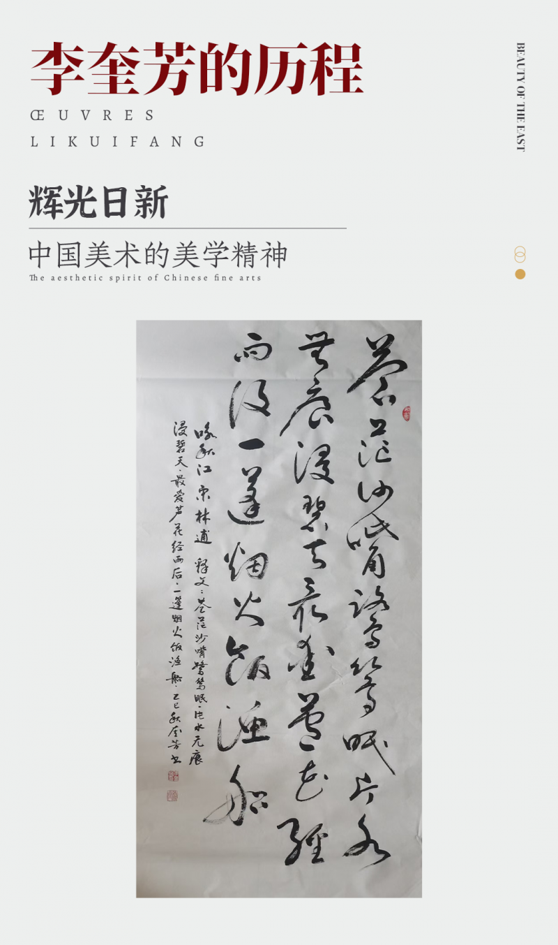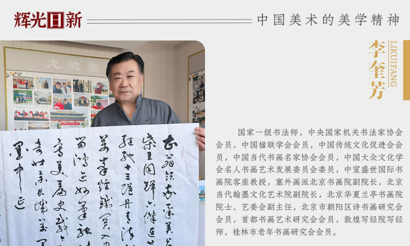 古往今来,凡有成就的艺术家,都对传统下过很大功夫,对砚田耕作有着坚强的毅力和信心,李奎芳就是一位传统功夫扎实,能够师古不泥古,溶古开新的书法家。他的作品能够撼动读者心灵,源于其生动的笔墨形态和深刻的内涵意韵,以及他对艺术追求的情感和理解,让人从他心手双畅的笔墨显露中感受的艺术的伟大,艺术的雅趣,艺术的内涵,艺术的情感。