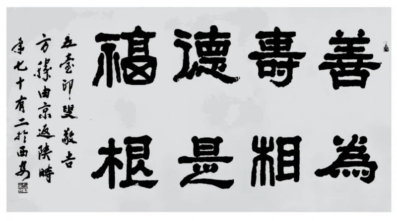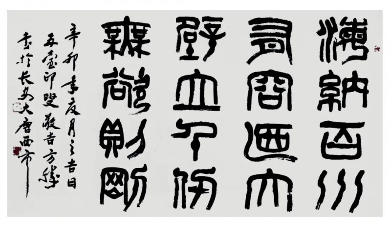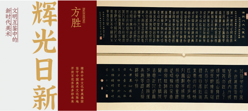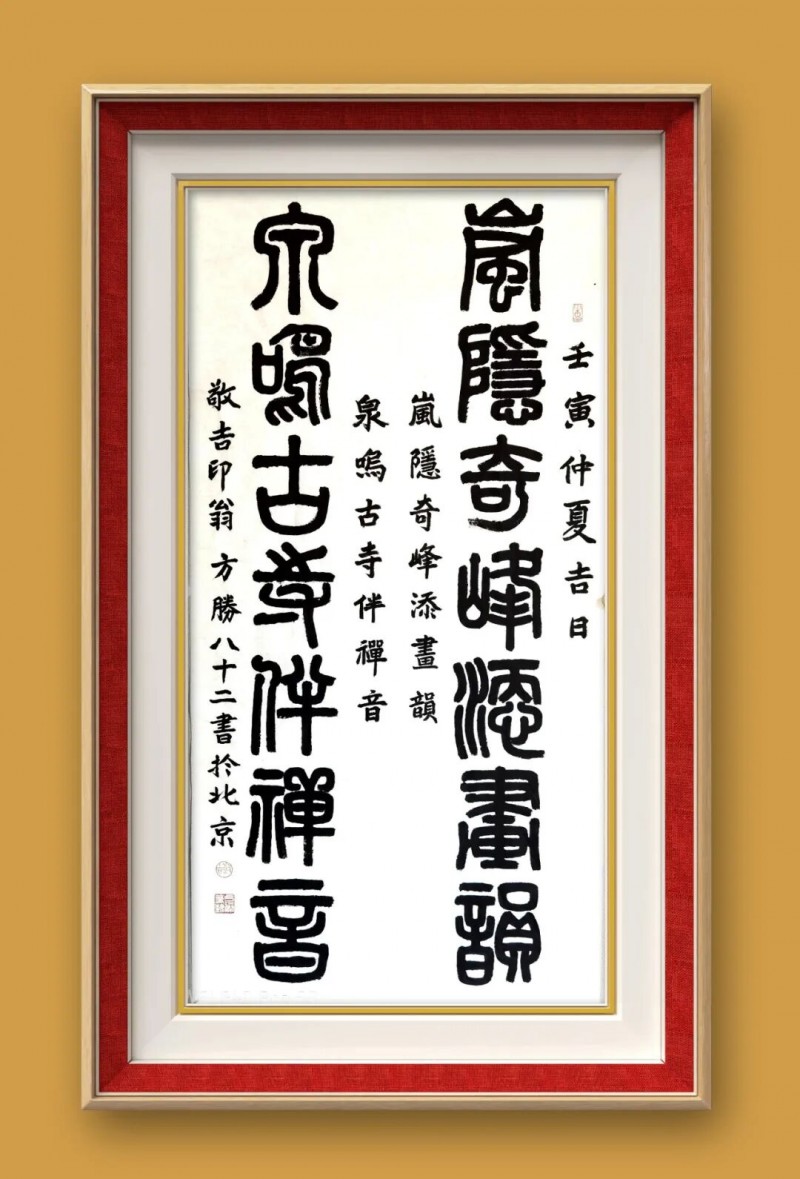“书法诸体皆能,以篆隶见长”,这是艺界对方胜书法的共识。1985 年考入清华美术学院的求学经历,为他打下坚实的学术根基,使其得以在传统书法的沃土中博采众长。他的篆书取法商周金文,线条如屈铁盘丝,在规整中见灵动,古拙里藏巧思,既有甲骨文的苍劲雄浑,又具石鼓文的恣意流畅,每一笔都饱含金石气息,仿佛能听见历史的回响。隶书则师法汉碑,将《曹全碑》的秀逸与《张迁碑》的沉厚熔于一炉,结体宽博端庄,笔力刚健质朴,浑厚遒劲中透着几分文人雅韵,形成 “刚而不拙、厚而不滞” 的独特风貌。