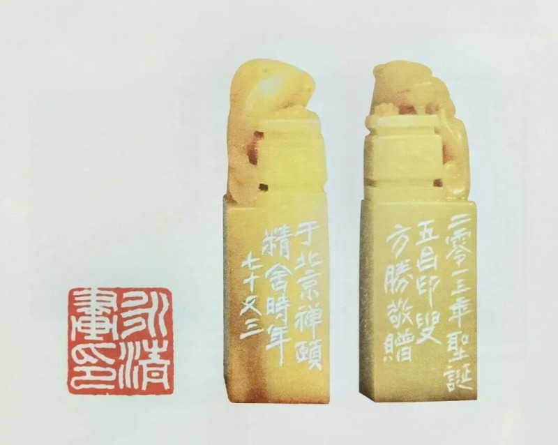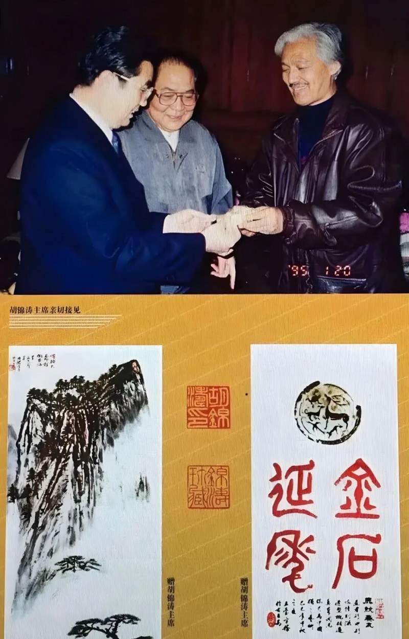 尤为难得的是,方胜将书法笔意融入篆刻创作,使印文线条兼具书写性与雕刻感,朱文印清丽秀雅,白文印雄浑大气,每一方印章都如一首浓缩的诗,既承载着千年印学的文脉传承,又蕴含着个人的艺术哲思。凭借这份深厚造诣,他曾为两届国家领导人刻制印章、挥毫作画,1995 年更受到胡主席的亲切接见,这份殊荣既是对其艺术水平的最高肯定,也是其作品家国情怀的生动写照。