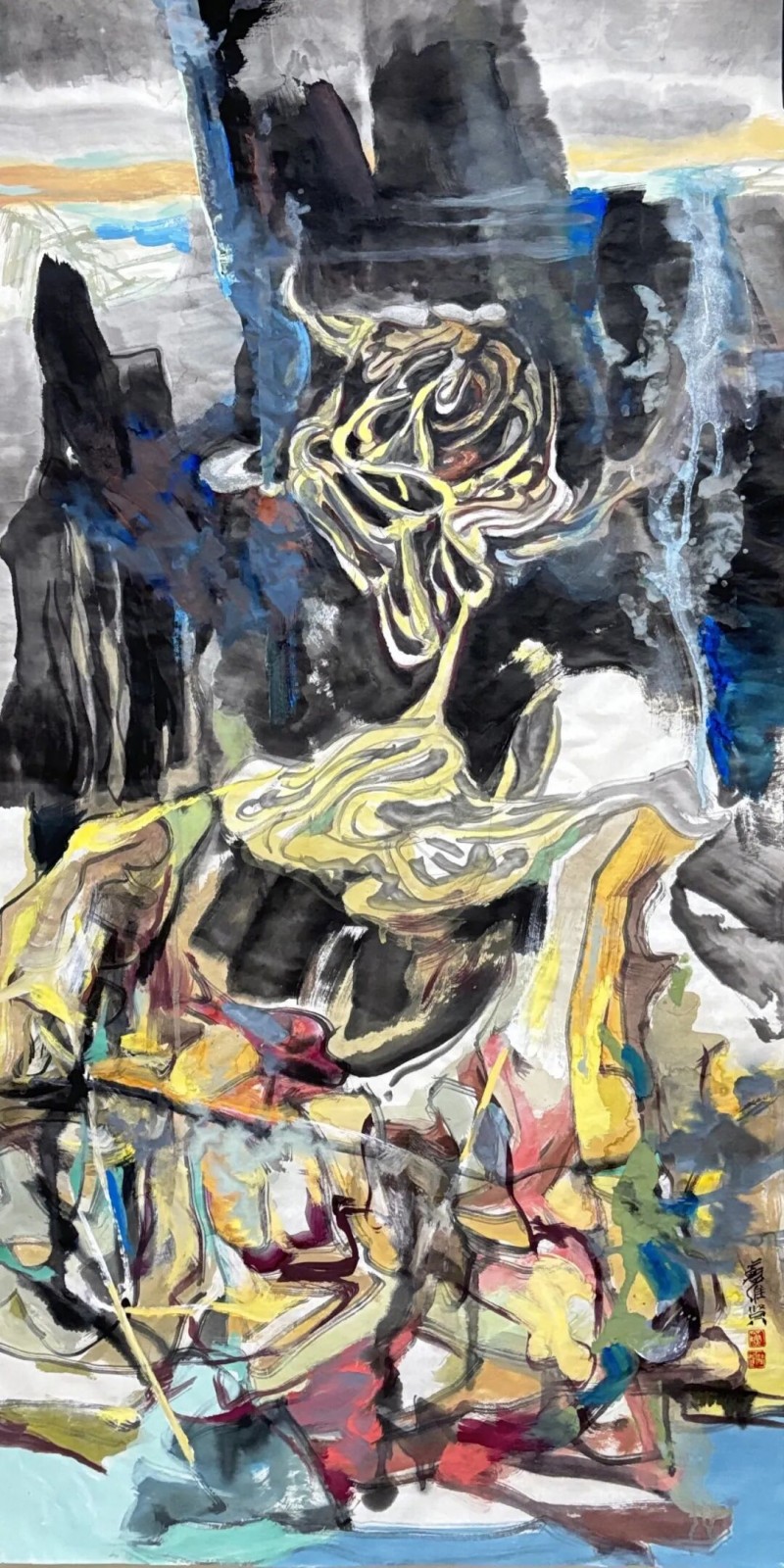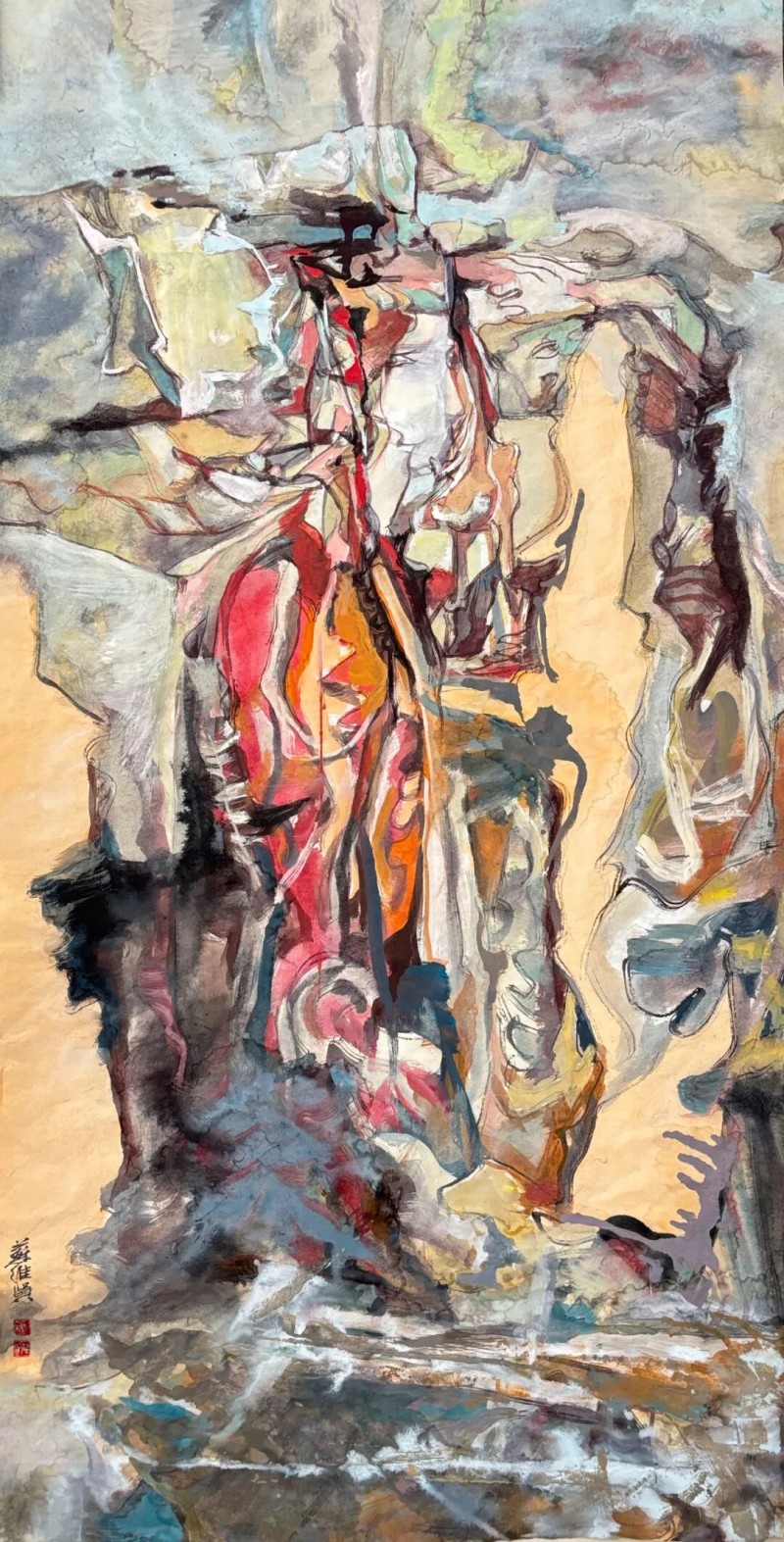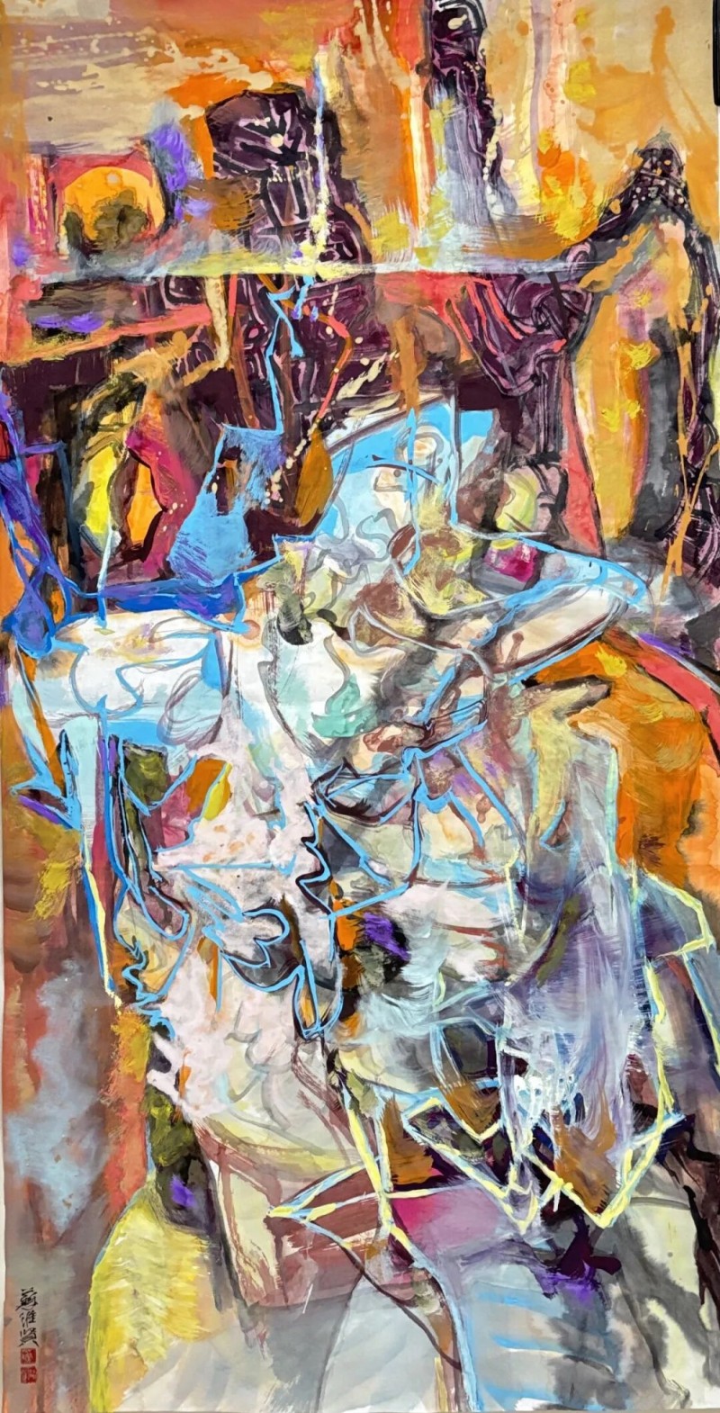 不仅如此,苏维贤在尝试将传统、现代,东方、西方,笔墨、色彩,叙事、形式的共贯融合,因此我们能在这些新作中看到很多未曾完全咀嚼消化的残片,甚至是缠斗的斑驳陆离的场景,似曾相识,然已莫能辨其渊源。纵览这批新作,能看到苏维贤在实验共贯融合的丰富性,他会在不同的画面上尝试新感受,在恣意中感受直觉性的存在。事实上,没有脱离控制的自由意志,苏维贤所有的新作都是对旧作的回顾、梳理、检讨和再创作。尽管这些直觉性的自由表现在过往的艺术生涯中屡有表露,这是其内在性情使然,然而这些新作还是展现出一种自觉的、整体的征候性的新变。不管是近半个世纪艺术生涯积淀的使然,还是对既往创作观念的不满足,乃至是自己对艺术甚至生命的新感悟和新思考,苏维贤都在新作中展现出了他蓬勃艺术生命的创造力和表现力。