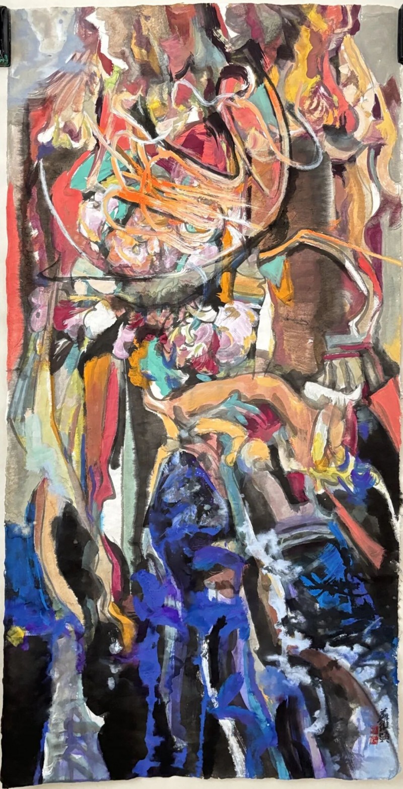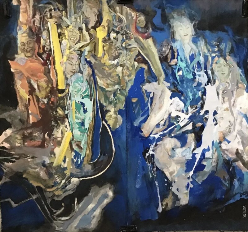 这些新作与此前的绘画实践之间还是有着紧密的关联,只是与其在中国文学和历史典故中提取创作主题和母题不同,苏维贤更注重由心而发的形式律动。相较于前期研究中国古代壁画色彩与形象的丰富变化,通过捕捉不断浮现的形象持续延展画面的尺幅形成长卷式的巨制不同,新作中偶发性的莫可名状的“乱力怪神”喷涌而出,是不讲道理的形象的堆叠、捏合、杂糅的并置,是酒神狄俄尼索斯的狂喜,是浑沌的神异世界的灵怪的纵情狂欢,以至观者无从辨析其由来,只能说是其内心中呼之欲出的幻象。当然,这是业已古稀之年的苏维贤有意为之,他试图忘记所有的法,以“无意识”的状态作画,凭着直觉作画,甚至有意将视觉形象含混起来,这样才能不断让笔墨和色彩获得自由表现的空间。换而言之,苏维贤认为构建形象与笔墨和色彩的自由表现之间存在隔阂,或者说,在大多时候,笔墨和色彩皆依附于视觉形象而存在,脱离形象的笔墨和色彩被驱逐至无关紧要之处,而现在自己所要做的,就是让笔墨和色彩,让直觉的自由表现占据画面中心位置,视觉形象成为笔墨和色彩,成为直觉自由表现的附属之物。显然,苏维贤在新作中并未表现出决然的转变,形象依然像躲藏在森林中的精灵一样不时探出头来,在酣畅淋漓的笔墨和色彩中,这些面庞像是消逝在记忆抑或是历史时空的游魂。