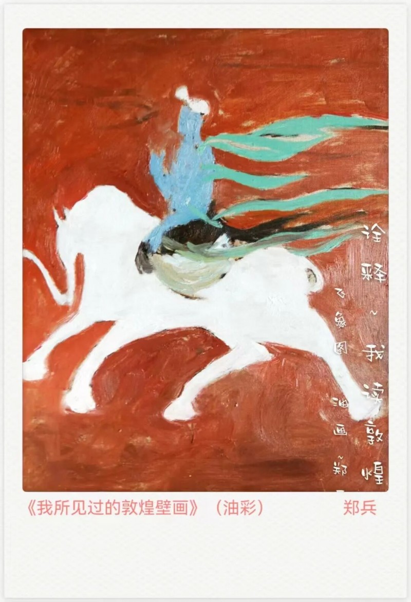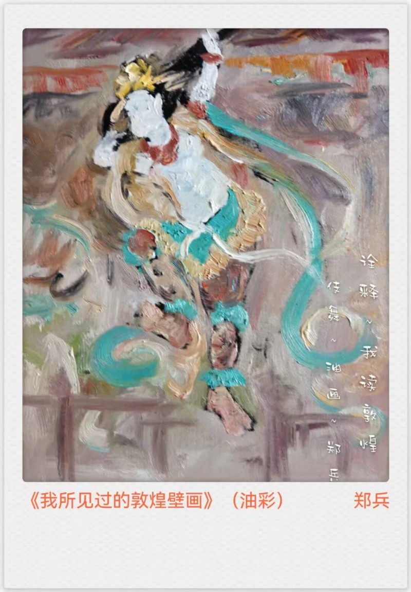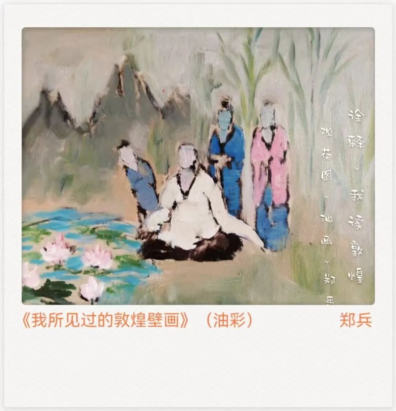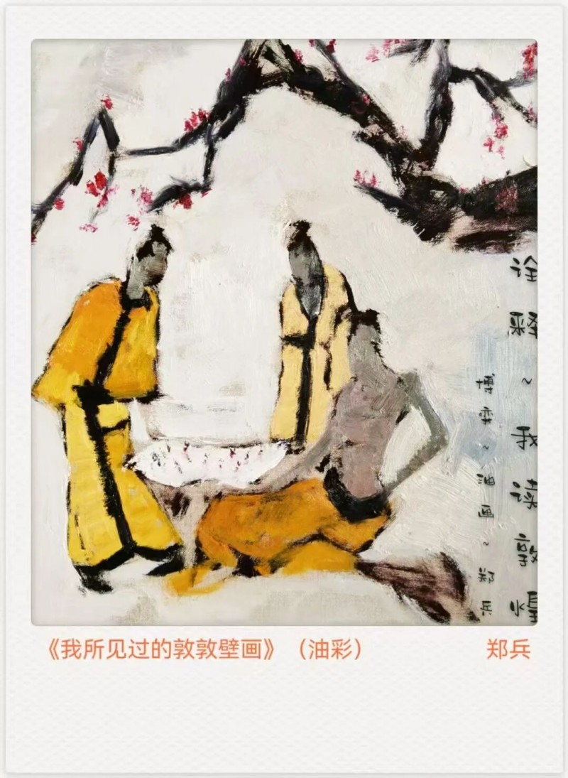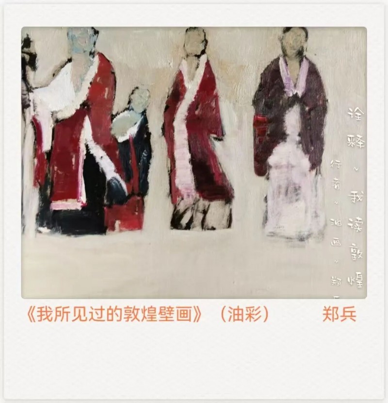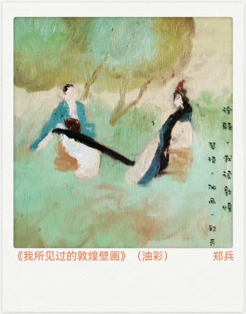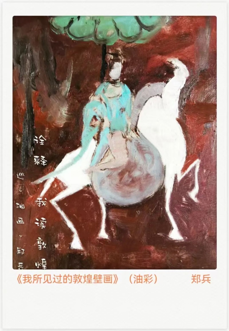 他在敦煌作画,面对祖先们留下的艺术精品体悟着艺术的精髓,他的艺术境界在不自觉间纯清如水,纯静成空气。有一国家级学术刊物责编看到《解读》一画时曾经提出要把此作品向海外介绍推出,他说再改一改,这一改就是好几年。郑兵为自已选择了一条苟刻自身走向成功的道路。这是不流俗的,是不与画坛世风相混淆的。我认为:不只是画人,所有门类艺术家的成功必须是从踏实、肯吃苦开始,都必须从做老实人开始。不具备这种活人操守的任何变法,都是浮躁轻浅的,不具备这种德性的任何理论,都只是嚼舌。