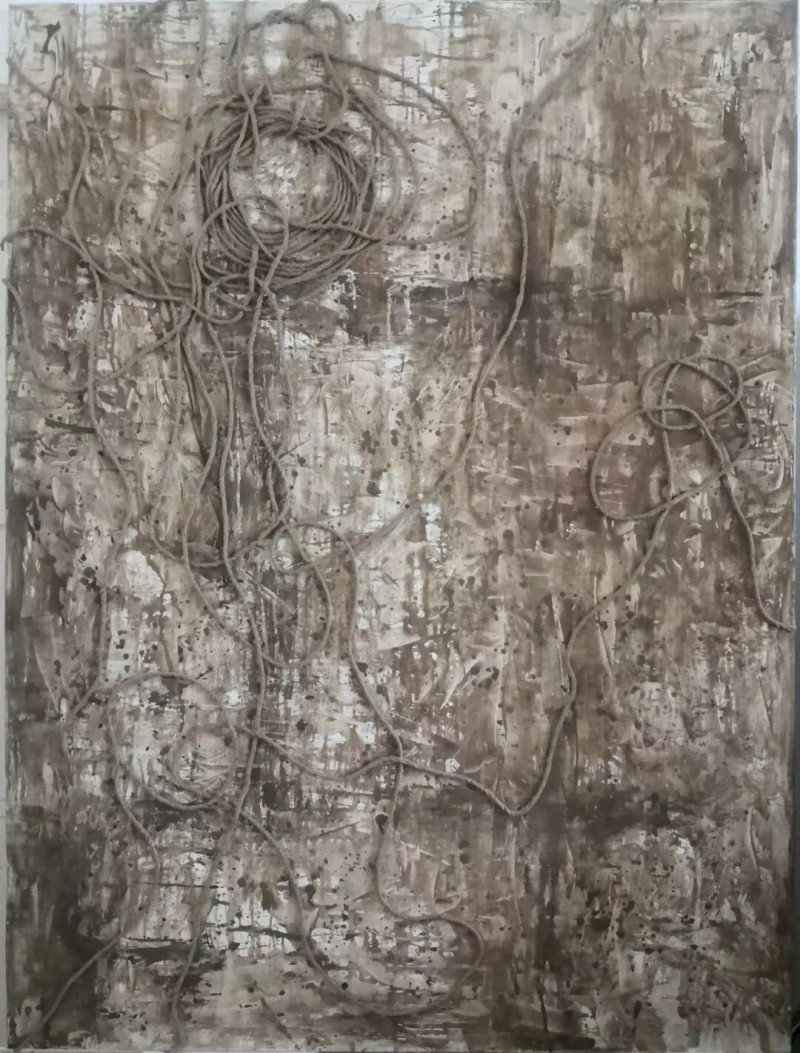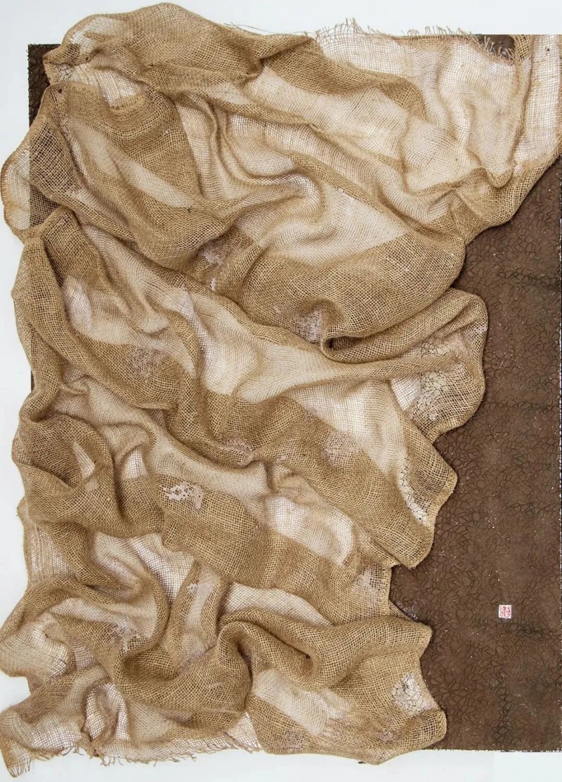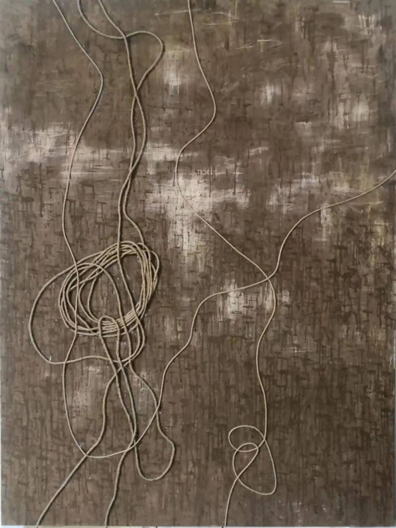 “殇土”系列创作充满一种悲情意味,具象、抽象、意象等多种手法交替运用,杭法基不断推翻、寻找和创造新的创作手法和直觉,过程显得有些执拗,却又十分动人。从20世纪60年代早期开始学画,至今杭法基已经从艺近60年。岁月的经验存留在作品中,形成艺术家个人艺术史叙事。早期油画与水墨实践的痕迹清晰地呈现在作品中,造型和结构的西方化,画面内在的东方哲学。殇土上偶尔出现的麻线和蕾丝,就像无数柔软的灵魂共同在这方土地上寻找栖居之所。藏而不露、含而不露与飞扬的画面共同作用,时而涓涓细流,时而惊涛骇浪。