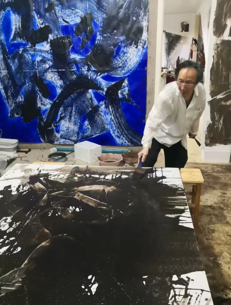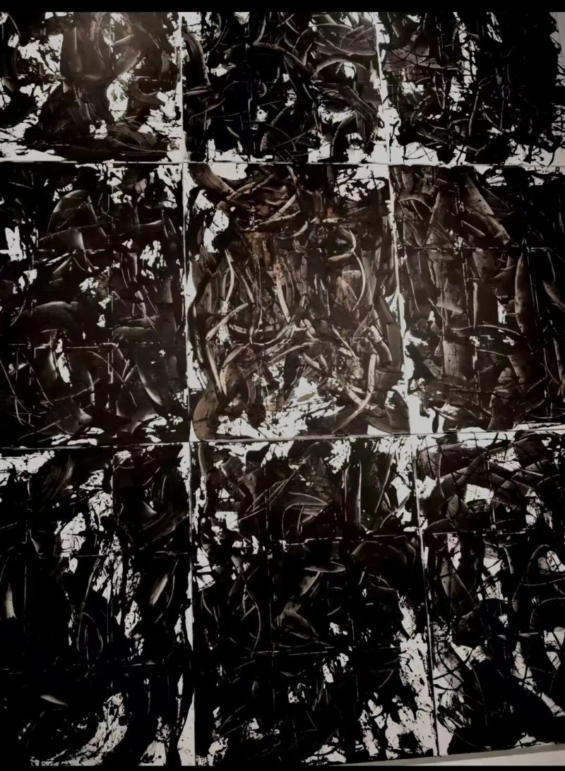 这种力量也体现在杭法基的创作状态中,由此也理解了他可以在70多岁时独立创作高达3.66米的《人物头像系列》,也可以在年近80岁之时,打破原有的自己。不到一个月时间完成2米×1.5米的九联画《生生不息》,展厅60多幅作品都是2023年创作完成。
