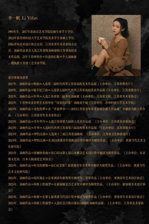 2025 年 12 月 20 日,由苏州工艺美院王月先生策展的“暗香花影——李一帆油画展”在苏州平江路金谷里艺术馆开幕。展览集中呈现了青年女艺术家李一帆老师近年来创作的一系列人物与静物油画作品。作品着重于纯色的展现,在构图与色彩的经营上兼具表现主义的味道,敏锐的感知力通过绚烂充满想象力的色彩和唯美又略带伤感的造型呈现于画面,为作品带来了一股属于这个时代的女性艺术家的新鲜感受。