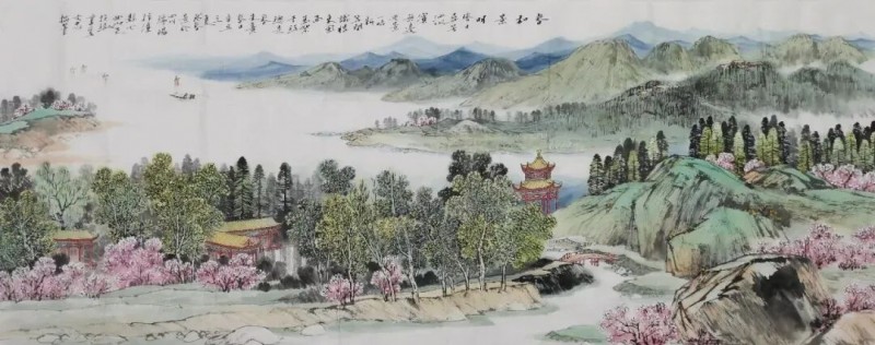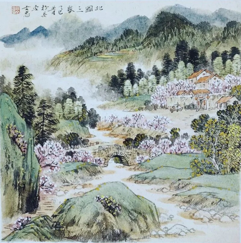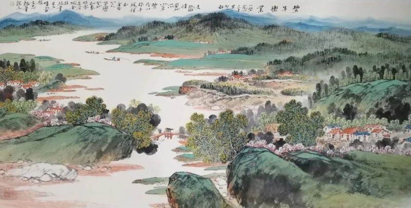 其山水画的色彩,郎润雅致,灵动冲和,有强烈的书卷气,又能很好地体现其题材上的创新。潘天寿曾说:“设色须淡而能深沉,艳而能清雅,浓而能古厚。”从孙文忠色彩可以看出他既遵循法度,又力求有感而作,描绘丰富的自然山水与生活,使自己的绘画呈现出当代性和时代感。因为色彩也是画家心灵中的心象,它具有精神意味,它的运用反映了画家的主观精神。因此,色彩所表现的气韵与画家修养是一致的,是画家心象的外化。如其《春回少陵塬》用色彩表现出春天的花团锦簇、一望无际的绿色原野,极为舒目,体现了春日明媚,生机勃勃、令人向往的美好田园。《汉江丽影》,在构图与色彩中,一一呈现出起伏的绿色山坡,鳞次栉比的楼房,清澈的江水,使现实生活中常见的景象,具有了诗意的美感,符合我们时代的审美需求。