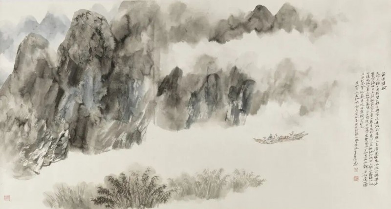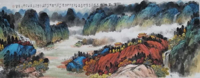 其山水画的构图式样丰富而富于创新。《不尽黄河古今流》《秦岭长云》《绿水青山伴我行》,属于全景式构图,视野阔大,能表现画家的博大胸襟。在继承传统笔墨的同时,又运用了西方的绘画技法与元素,借鉴了光影的表现手法。
