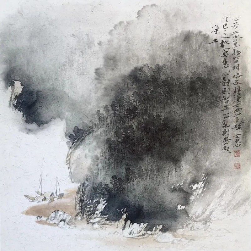 笔墨是孙文忠中国画创作最为注重之处。我们知道,笔墨是中国画独特的绘画语言,也是中国画的灵魂所在,而这恰恰是通过笔与墨的交融运用体现出来的。其中笔是中国传统文化最具特色的工具,也是中国画线条形成的前提。孙文忠充分认识到书法之笔对绘画的作用,下苦功夫临习过各类古代碑帖,以此强化自己对线的把握与运用,并注重将书法的特点引入自己的绘画创作之中,使笔下之线富于变化,又得心应手。墨是表现中国画的语言,也是形成中国画墨色变化的介质。从黄宾虹开始,将墨分为浓墨、淡墨、破墨、积墨、泼墨、焦墨、宿墨七法,这对当代中国画产生了重大的影响。在笔墨之间,笔和墨都不是独立存在的,论用笔法,必兼用墨,墨法之妙,全以笔出。对于笔墨的运用,孙文忠有许多心得,他说:“用笔溅墨要灵活,以笔挥洒墨色要神化不拘。用墨要有高度的技巧,这样才能灵活运用。用笔如果没有丰富的生活体验,就不能神化;如果只有熟练的技巧而缺乏对生活的理解,就只能长于用墨而拙于用笔;如果有丰富的生活体验而缺乏熟练的技巧,也只能长于用笔而拙于用墨。大自然的各种面貌呈现在画家面前,画家就要具有把握和感受大自然的能力,如果不具备这样的能力,就无法使山川万物曲尽其态地表现在画面上。”孙文忠道出他对笔墨的感悟与运用之法。山水画是孙文忠的主攻方向。在传统的中国画中,山水画享有崇高的地位,因为山水画不仅能看到画家的笔墨技巧,也可透视画家的人文精神,更能体现画家全面的学为与修养。