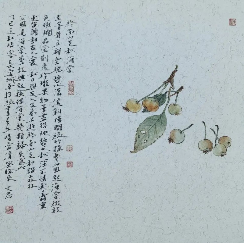 他的花鸟画小品,让人过目不忘,流连忘返。中国传统花鸟画,从五代开始,经过千年不断的发展,技巧丰富,成为一种独特的艺术载体。早期的花鸟画,一是以黄筌为代表的工细院体画,一是以徐熙为代表的写生花鸟画。元代文人画的大兴,遂使花鸟画成为文人书写自我的一类画种。明清两代的写意花鸟画更是将传统的花鸟画推向一个新的高峰。孙文忠花鸟画虽然是小写意,但他既不同于宋代院体画,也不同于元代的文人画。他的作品吸收了传统花鸟画中的写生精神,也显现了他的造型能力和素描功底。在孙文忠的笔下,不论是鸟类,还是昆虫,姿态优美,栩栩如生。写意的花草,衬托出鸟或昆虫的精致细微。他的小品画,既有北方墨客的清健格调,也有南方文人的雅淡蕴藉,形成了生动自然、富有意味的个人风貌。他的花鸟小品如《天竺》《春暖花开》《笔端飞出黄金果》等等,用没骨手法画出,不着线条,将叶片、花朵轻松地描绘出来,令人愉悦。这正是宋元以来文人画所运用的水墨晕染技法,孙文忠这类作品强调的是物像的空间真实感,令人回味。