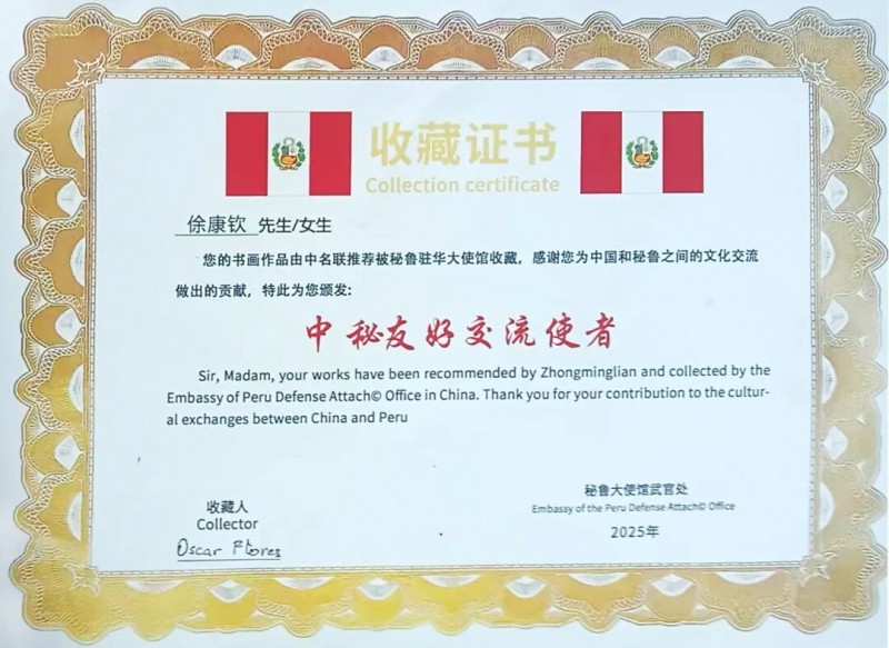 2025年5月,作品被秘鲁驻华大使馆高价收藏;