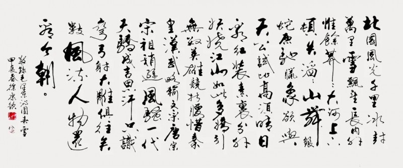 走进徐康欽老师的书法,迎面扑来的五体书法琳琅满目。小楷《心经》里钟繇“凝重沉朴、古拙天真”之用笔依稀可见;王羲之《道德经》里的“平和简静、端庄雅致,飘逸自然”的笔法跃然纸上;自然亦少不了赵体《妙严寺记》里“丰腴妍媚、婉转秀劲”的影子。行书作品《沁园春.雪》、《赤壁怀古》中《兰亭序》里“尖锋入纸、纵有行、横无列、大小参差、点化映带、气脉贯通”之高超笔技和谋篇布局随处皆现;榜书《运鸿财茂》等作品里颜楷的“丰润雄浑、磅礴大气”和柳书的“挺拔瘦劲、潇洒清秀”及赵楷之“圆润遒劲、端秀劲挺”的影子均依稀可见。隶书作品《细水长流》等作品中《曹全碑》里的“蚕头燕尾、一波三折、左劲右拙”之笔法表现得淋漓尽致;篆书巜道德经》等作品尽显了“因形立意、体正势圆及左右不见撇捺”的笔法与结字特征;草书{岳飞,满江红}等作品“穿插避就、向背揖让”之生动活波,奇险多变”的书体面貌跃然纸上!