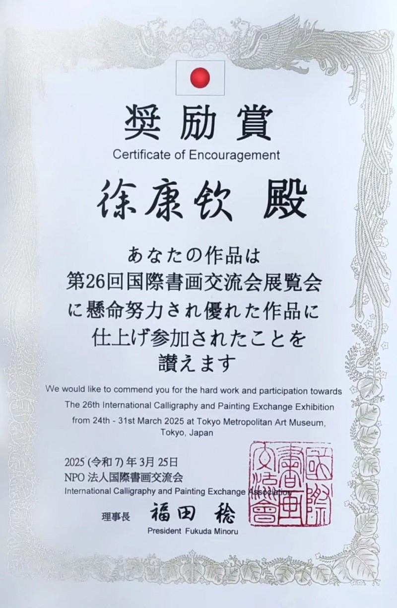 2025年3月,应邀赴东京参加第26届国际书画展并获铜奖;