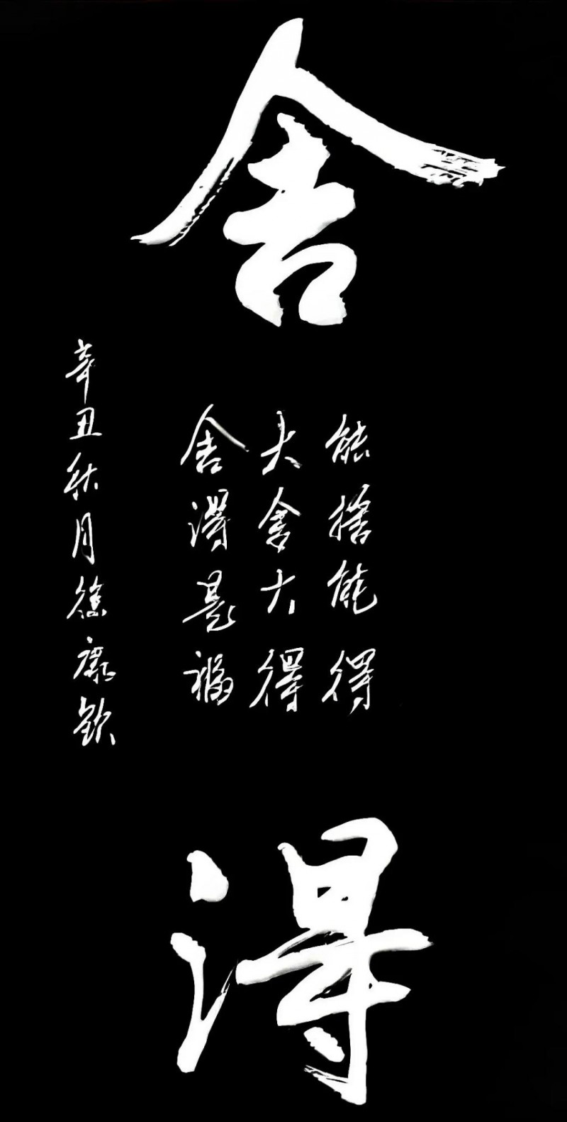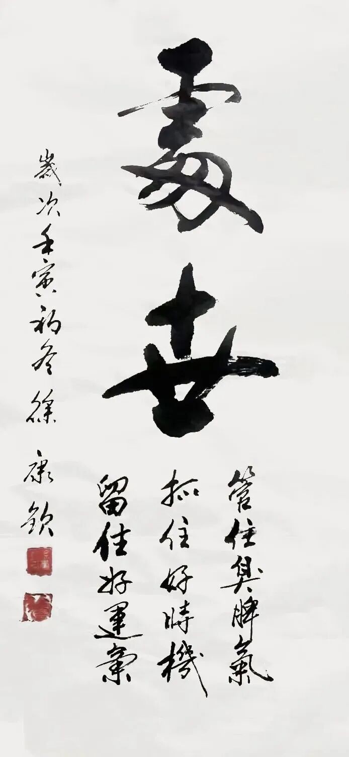 纵观徐康欽老师之各体书作,无不体现了“以古人之规矩,开自我之生面”的创作理念。尤其要提及的是,徐老师的榜书笔墨与结体之端庄敦厚、精神飞动让人见了顿觉清凉爽快,力透纸背的笔触有效地彰显了其精神钁铄的健壮体魄及其饱经沧桑的人生阅历和刚柔并济的性格使然。以字寄情、以情寄意赫然纸上,直至让字有了情商。徐康欽老师的榜书作品曾一度被水墨画大师“一指禅”金大建老师誉为“将军字”,深受各需题写扁额人士的青睐,在上海、北京、苏州、福建的龙岩、武平等地广为流传。