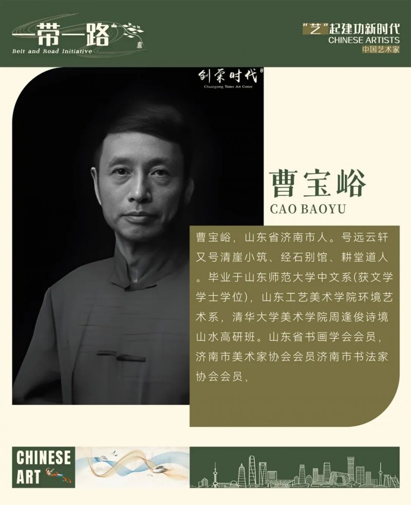 曹宝峪,山东省济南市人。号远云轩又号清崖小筑、经石别馆、耕堂道人。毕业于山东师范大学中文系(获文学学士学位),山东工艺美术学院环境艺术系,清华大学美术学院周逢俊诗境山水高研班。山东省书画学会会员,济南市美术家协会会员,济南市书法家协会员。