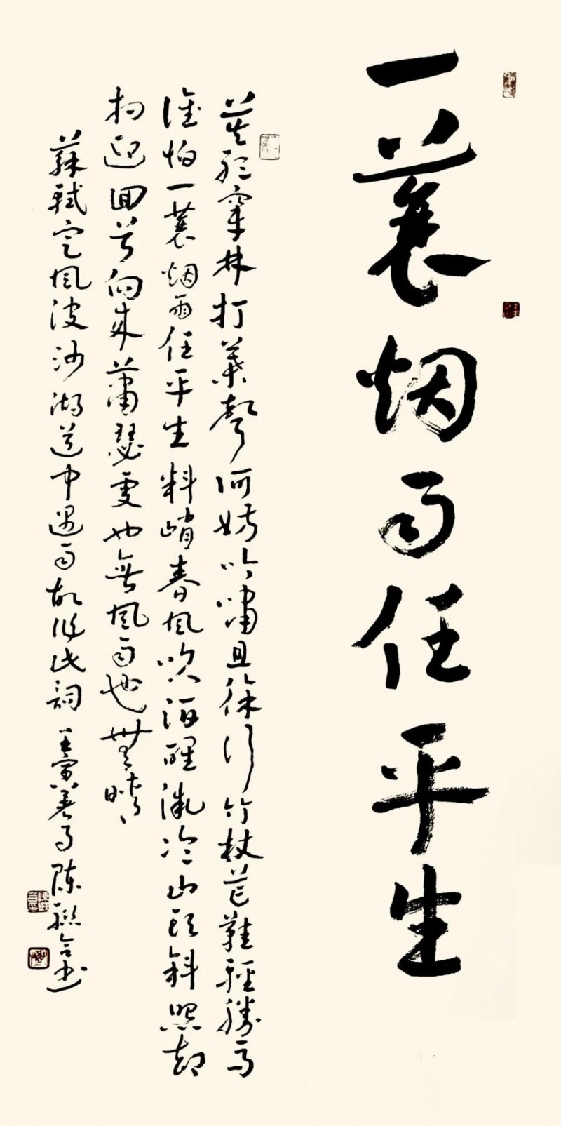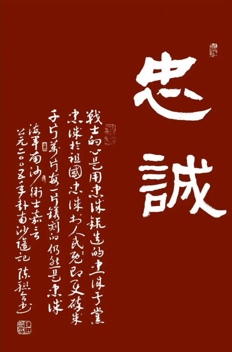 军旅生涯是陈联合艺术风格形成的重要根基。长期的军旅生活,赋予他严谨务实的作风与刚健豪迈的气质,这种精神内核自然而然地融入笔墨之间,使其书法作品兼具筋骨与气度。不同于传统文人书法的温婉含蓄,他的作品中多了一份军人的刚毅与担当,笔力遒劲雄健,线条挺拔有力,如长枪大戟般舒展洒脱,尽显军人的豪情与气魄。无论是擘窠大字还是精致小楷,都能感受到那份源于军旅的精气神——结构严谨而不失灵动,章法规整却富有变化,将“力”与“美”完美融合。