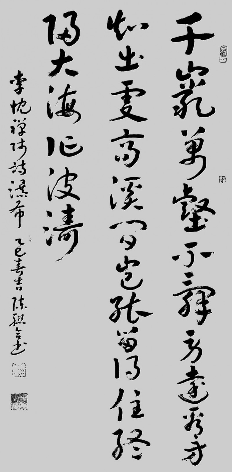 同时,作为中华诗词学会会员、野草诗社副理事长,他的诗词创作功底为书法作品注入了浓郁的书卷气。他往往自撰诗词、自拟楹联,再以笔墨书写,实现了“诗、联、书”三位一体的创作模式。这种创作模式,要求创作者兼具扎实的文学功底与高超的书法技艺,而陈联合无疑做到了这一点。他的作品,不仅是视觉上的审美享受,更是文学上的精神熏陶,观者在欣赏笔墨之美的同时,更能领略到诗词楹联的意境之妙,感受到中华传统文化的博大精深。