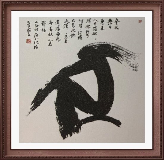 他的书法作品,堪称一场视觉与精神的盛宴。笔走龙蛇间,满纸云烟缭绕,气韵生动流转。每一笔、每一划,都蕴含着他对汉字架构、布局、空间的独特理解与创新诠释。他将“象”与“意”有形化,通过精心的布局设计,让单幅作品如一座山峦般巍峨,不仅带来强烈的视觉美感,更蕴含着观世悟道的深邃隐喻。这种对形式与语言的极致追求,使得他的书法作品超越了单纯的文字书写,成为表达内心灵韵、展现理性思维与形象思维交融的艺术杰作。