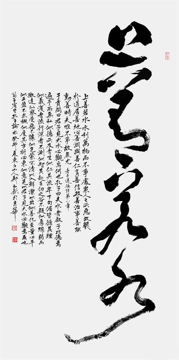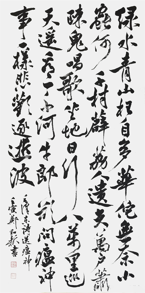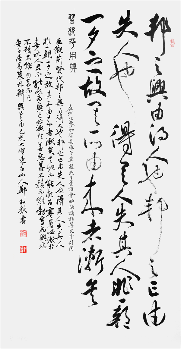 书法艺术的核心主旨,即是在于体现书法家本人的文人内涵和情感品性,正如清人刘熙载曾于〈艺概〉一书中所言,是谓故书也者,心学也;写字者,写志也。而作为当下书坛界内的一位翰墨名家,郑和新先生的书法气象便就是有深谙于此道!并且梳理郑和新先生的书法历途,我们也更是能深刻感受到他本人那深厚的文化积淀,是谓笔墨可见高韵深情,书风可感坚质浩气也,心笔同修,功成非凡!