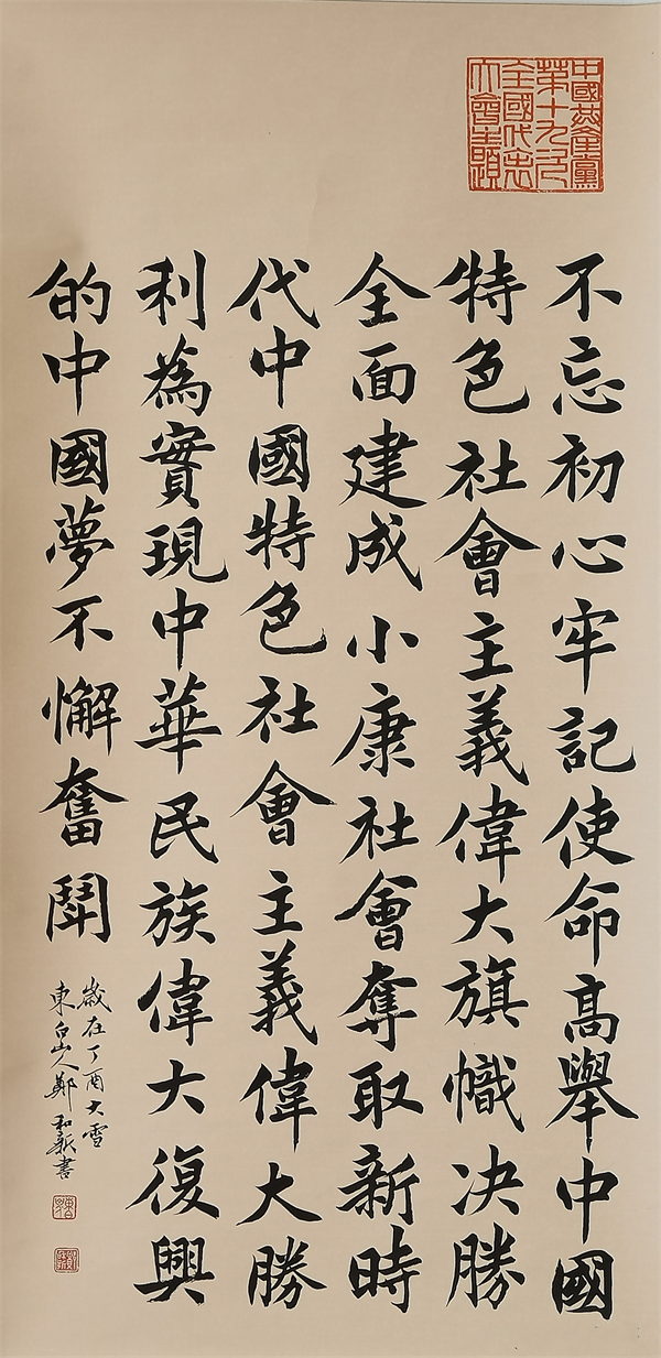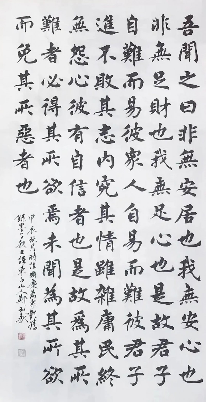 法古为师,书功大成。自习书以来,郑和新先生耕耘墨海而不懈怠,临池碑帖而不媚俗,致使经年累月的潜心积淀,终可成为矗立于书坛高峰的基石!尤其是在俗风盛行弥漫,匠气已成常态的今天,能够像郑和新先生这般具有清醒认知的传统书家,早已是寥若星辰。但也正因如此,郑和新先生的书法造诣也才会显得更加珍贵!取法师正道,挥毫皆性情,传统文人精神的创作担当,诚可令人由衷敬佩,斯造妙矣,书道毕矣!