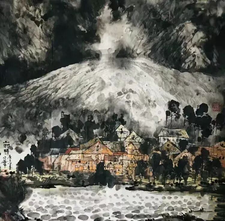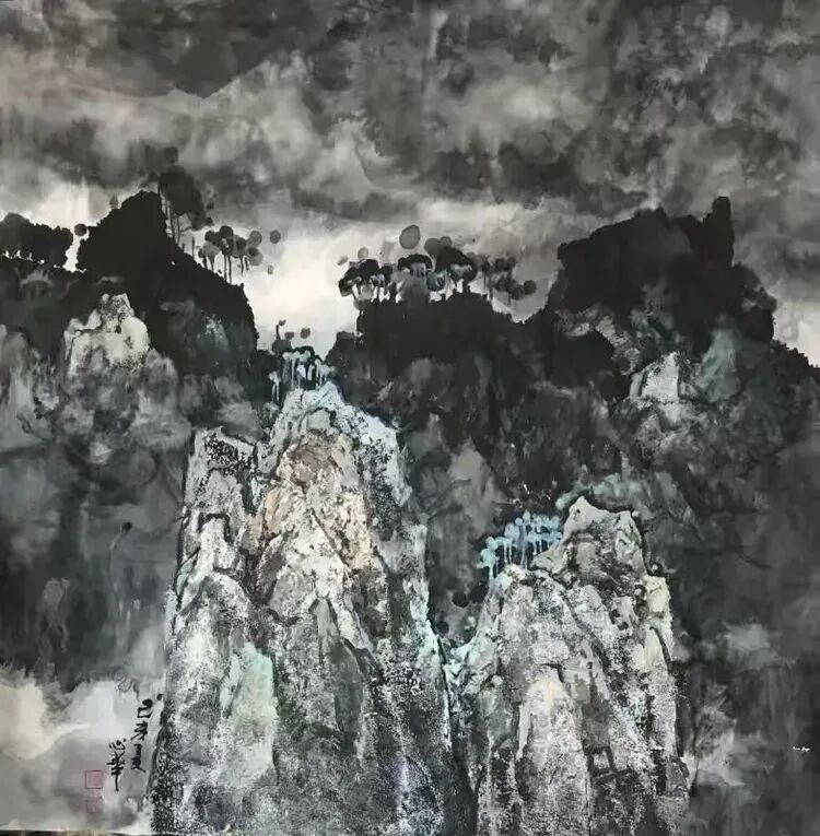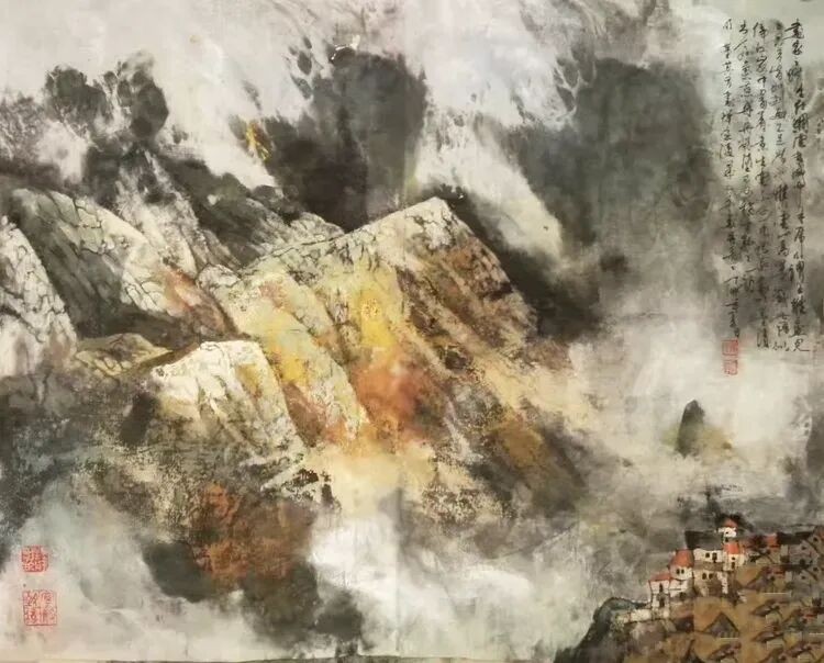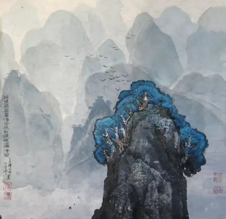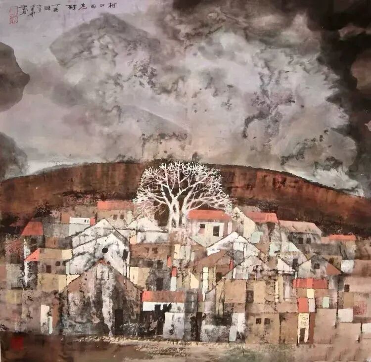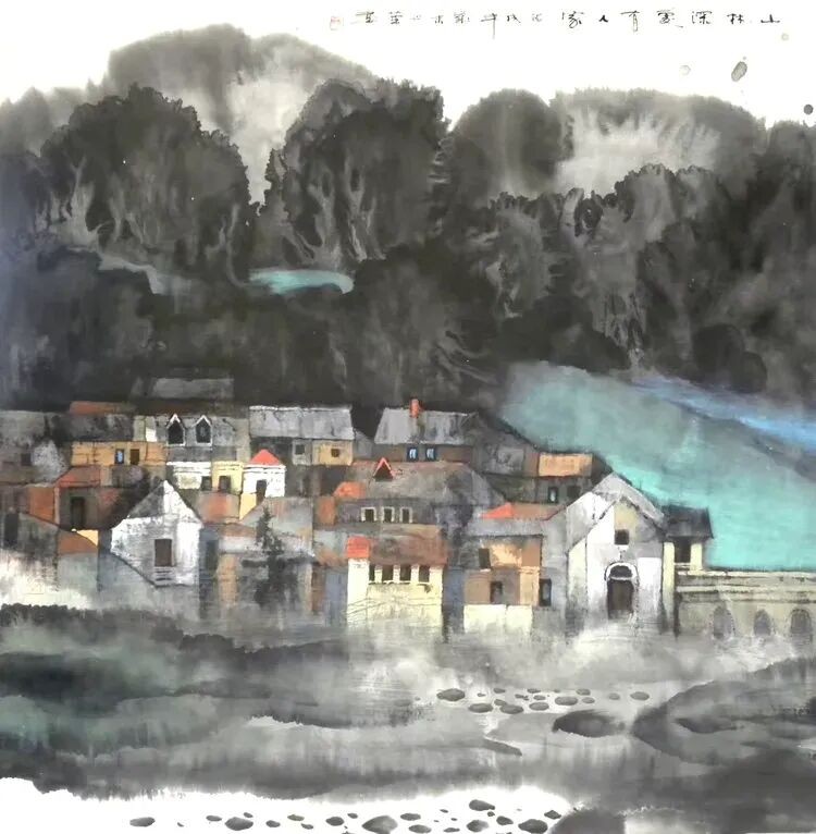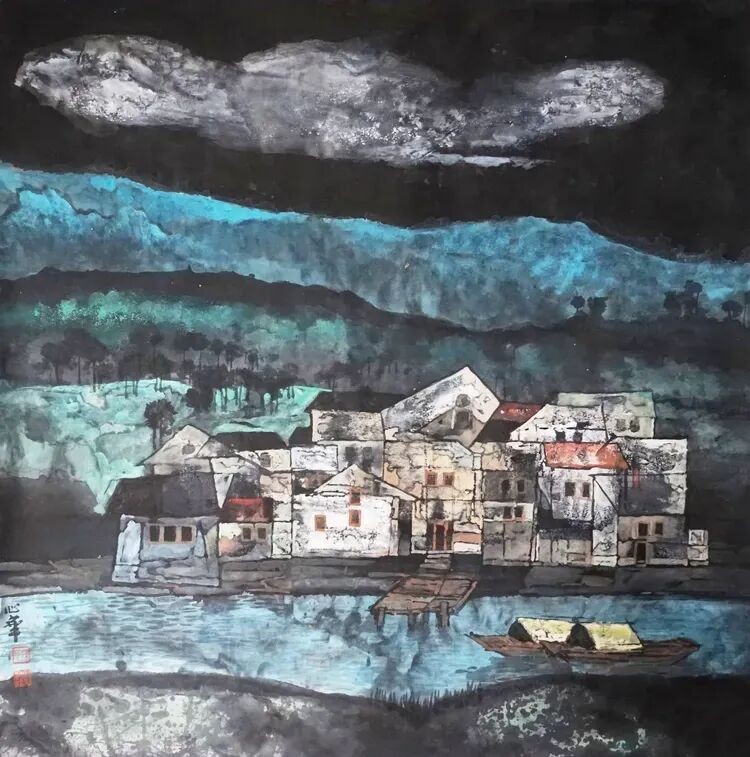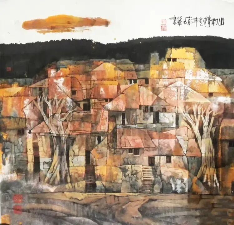 他将“气韵生动”融化在对主题意境的创造和对山水景物精神气质的领悟中;他将“骨法用笔”融化在行云流水、山石树屋纵横交错所形成的力度中;他将“应物象形”溶解在通过对客观对象的取舍、夸张、想像、提取其基本元素后的重组合中;他将“随类赋彩”溶解在整体色调与装饰色块的构成中;他将“经营位置”溶解在点、线、面的平面构成和几何形体的打散重组中;他将“传移模写”融化在对古今中外大师表现技巧的广泛吸收和综合运用中。