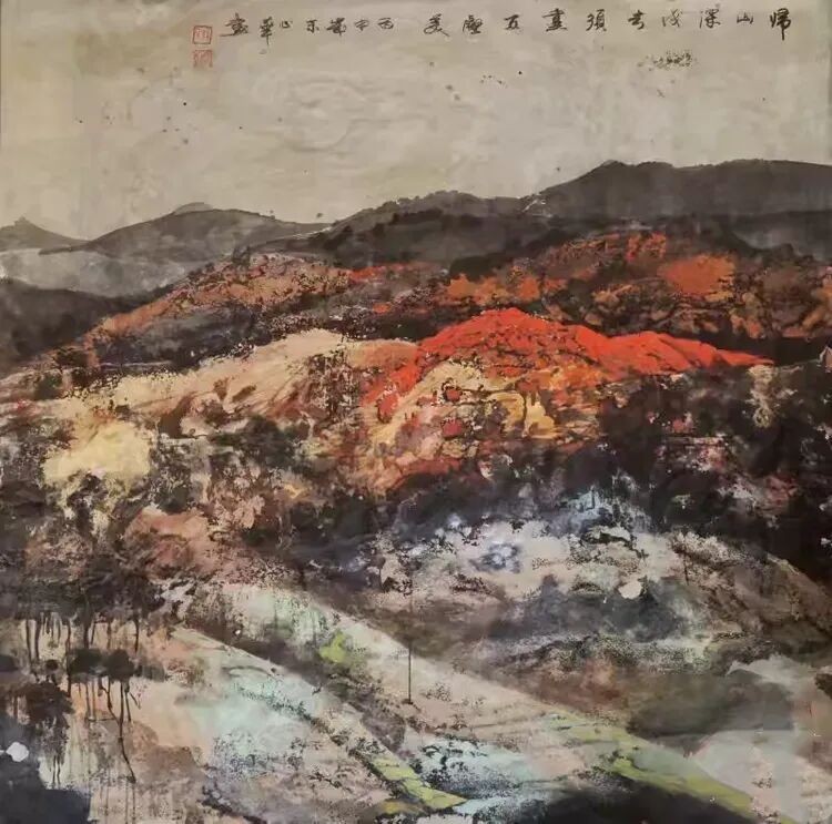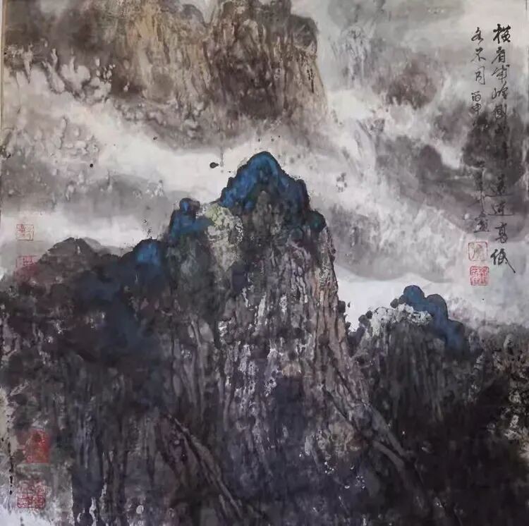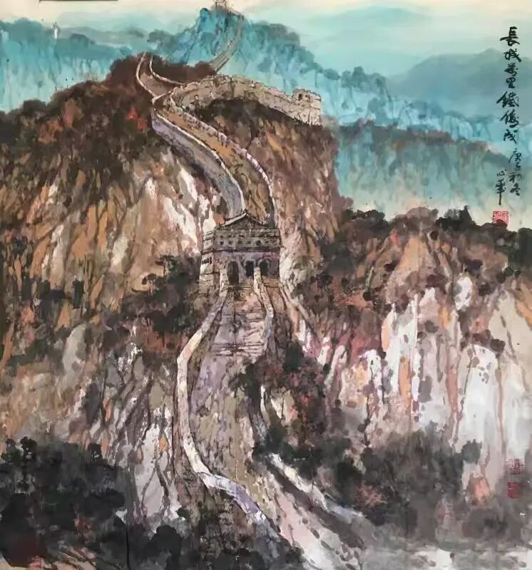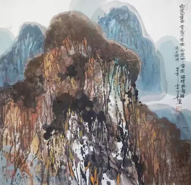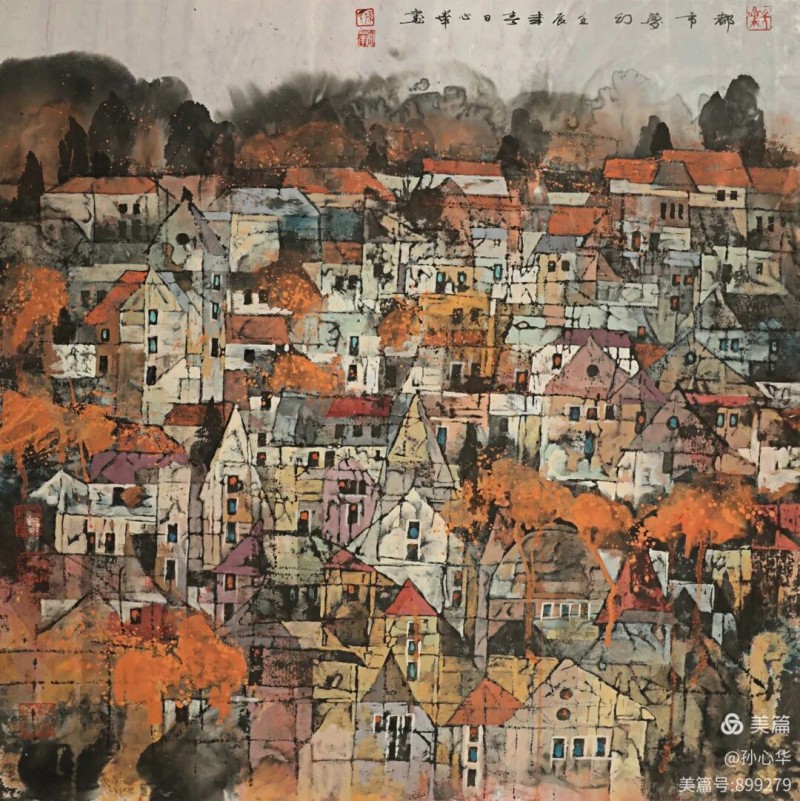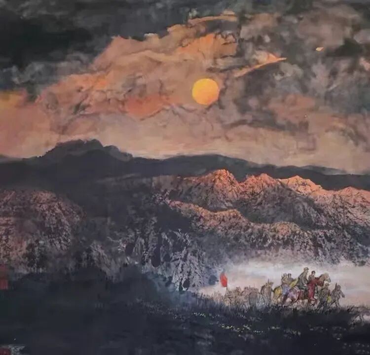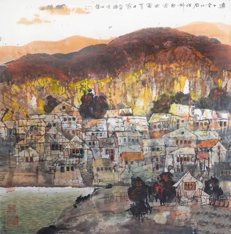 他将“气韵生动”融化在对主题意境的创造和对山水景物精神气质的领悟中;他将“骨法用笔”融化在行云流水、山石树屋纵横交错所形成的力度中;他将“应物象形”溶解在通过对客观对象的取舍、夸张、想像、提取其基本元素后的重组合中;他将“随类赋彩”溶解在整体色调与装饰色块的构成中;他将“经营位置”溶解在点、线、面的平面构成和几何形体的打散重组中;他将“传移模写”融化在对古今中外大师表现技巧的广泛吸收和综合运用中。