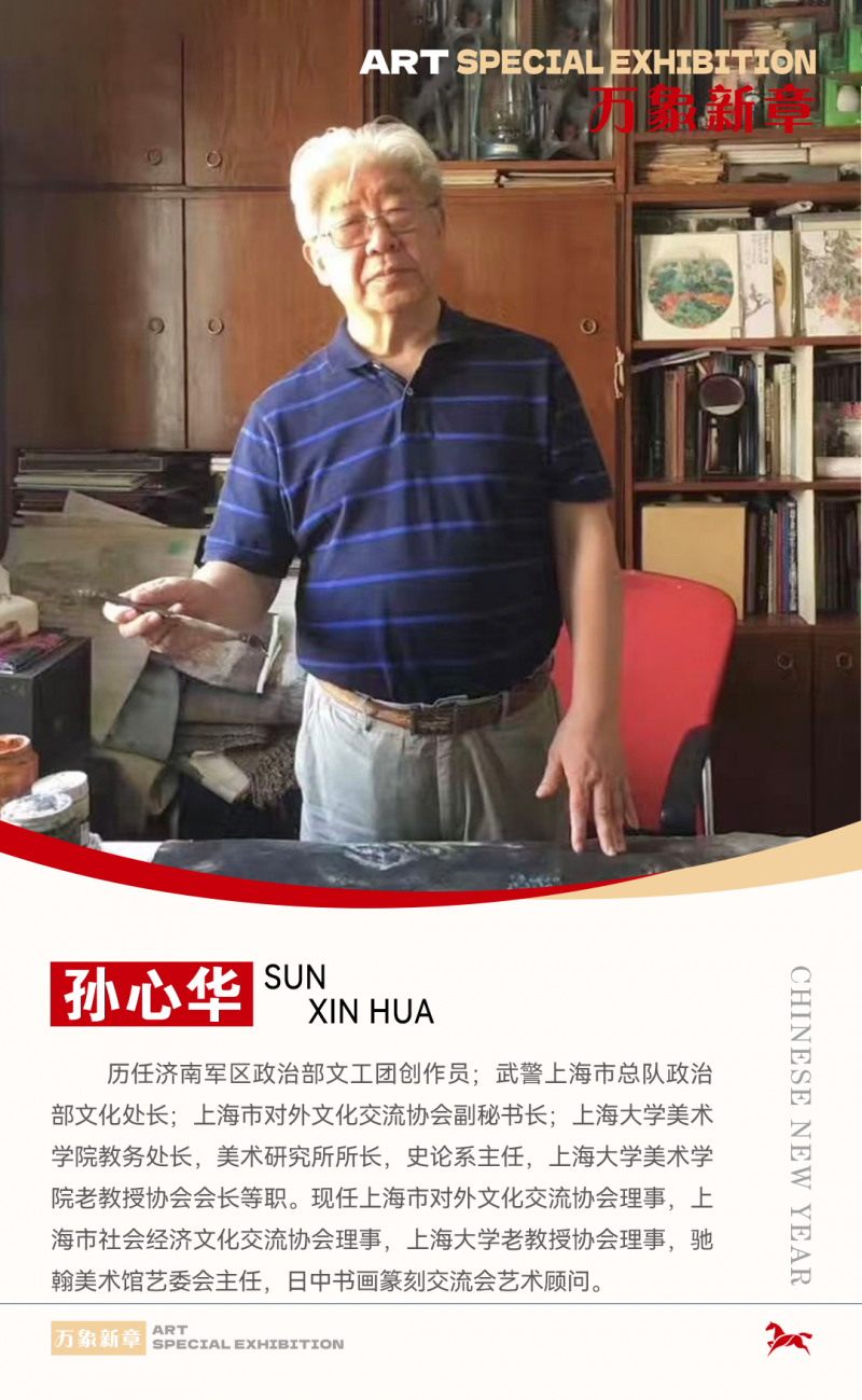 孙心华:1945 年出生于山东,1960 -1969 年毕业于中国美术学院附中、本科。历任济南军区政治部文工团创作员;武警上海市总队政治部文化处长;上海市对外文化交流协会副秘书长;上海大学美术学院教务处长,美术研究所所长,史论系主任,上海大学美术学院老教授协会会长等职。现任上海市对外文化交流协会理事,上海市社会经济文化交流协会理事,上海大学老教授协会理事,驰翰美术馆艺委会主任,日中书画篆刻交流会艺术顾问。